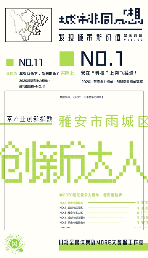 今天带大家“尝鲜”的是雅安市雨城区。在《2020川茶竞争力榜单》中,雅安雨城区摘得创新指数榜的单榜冠军。雨城区在川茶产业其他各方面的竞争力又如何呢?我们用数据来揭晓!