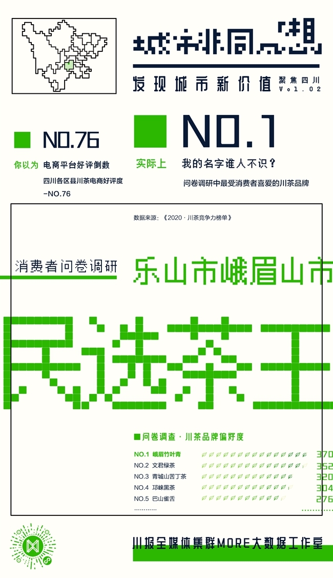 今天为大家带来 “尝鲜”的是乐山市峨眉山市。在《川茶知晓度&消费者满意度问卷调研》中,峨眉竹叶青茶以最高票,当选“最受消费者喜爱”的川茶,是名副其实的“民选茶王”。峨眉山市在川茶产业其他各方面的竞争力又如何呢?数据来告诉您!