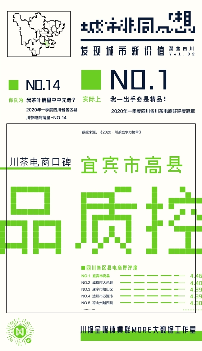 今天为大家“尝鲜”的是:凭借4.46分(满分5分,下同)的好评度,摘得2020年一季度川茶电商销售口碑之冠的“品质控”——宜宾市高县。高县的茶产业在其他方面的竞争力又如何呢?以数为据,为您分析!