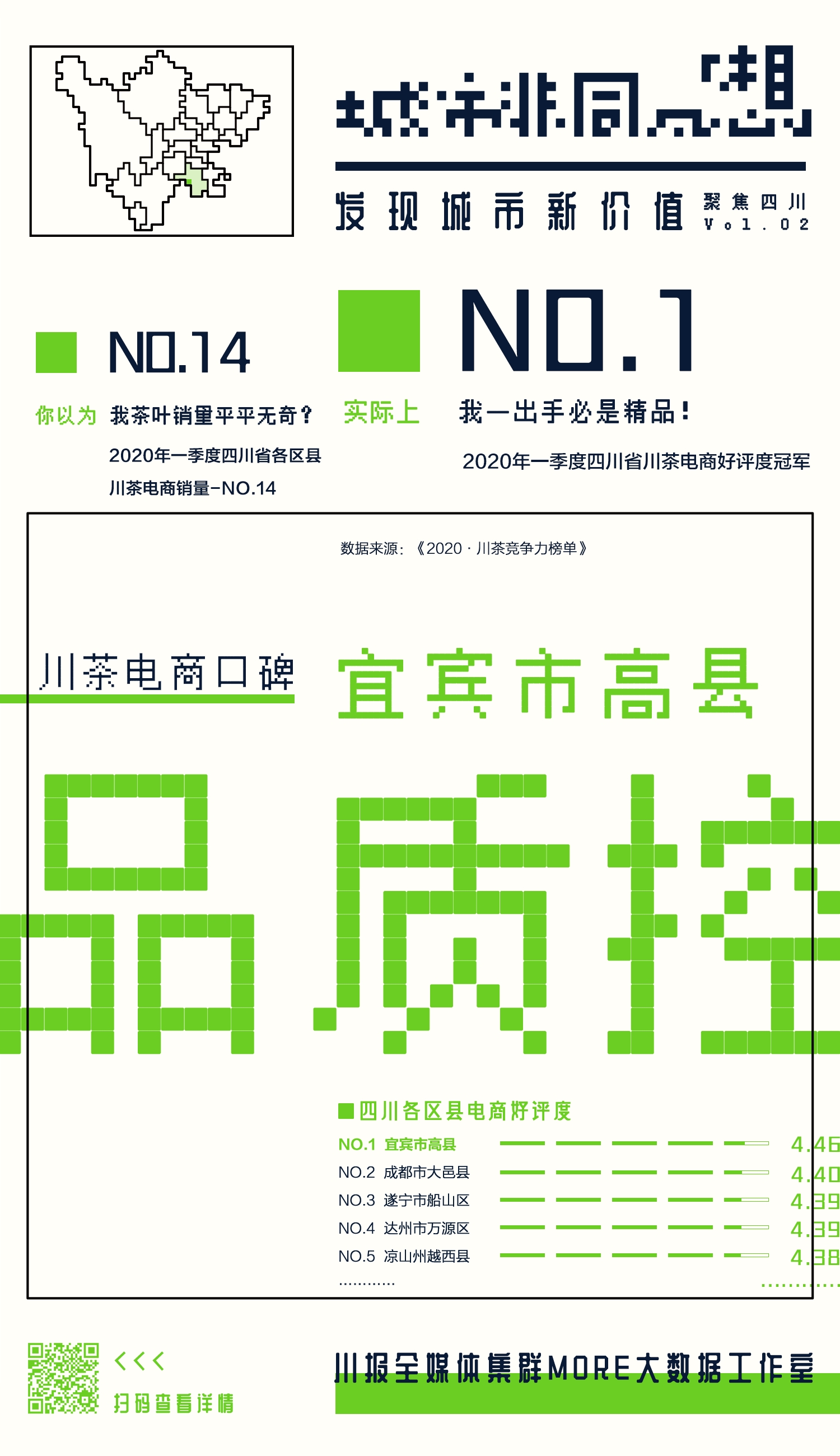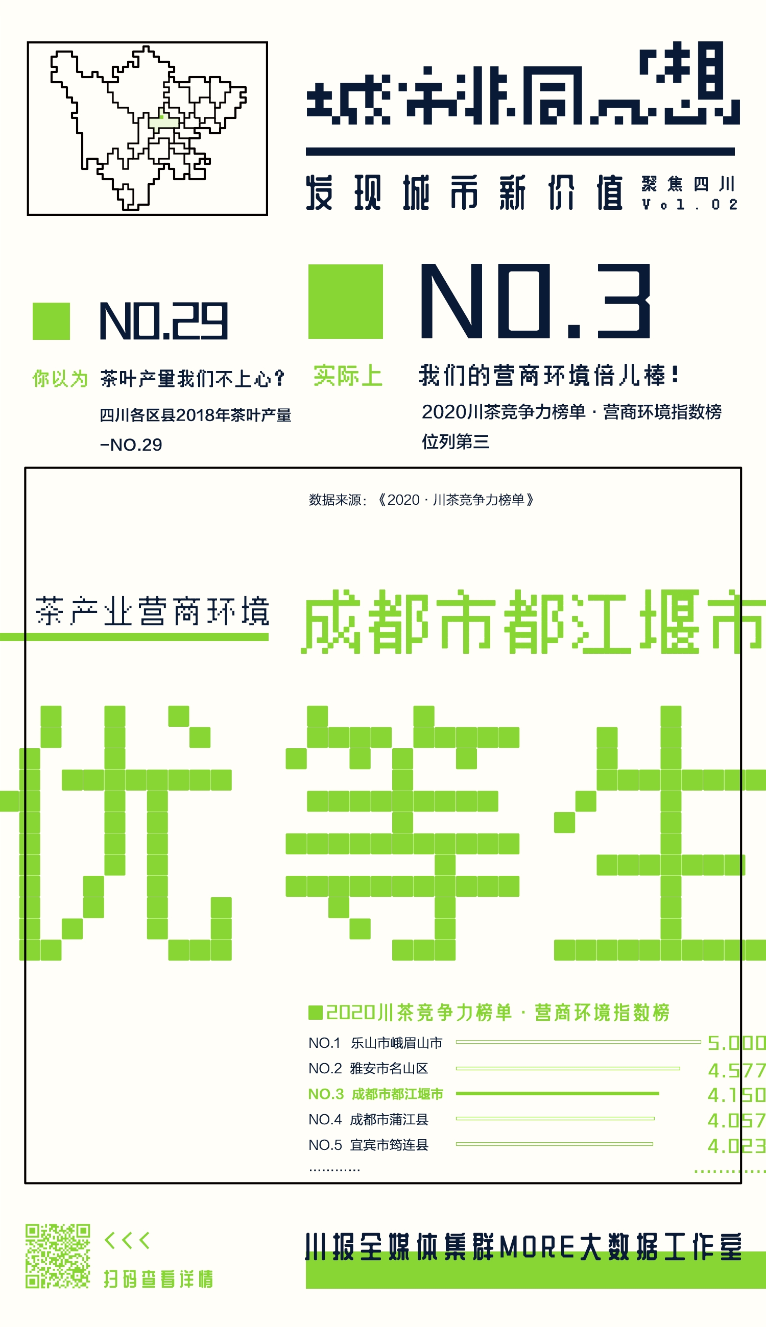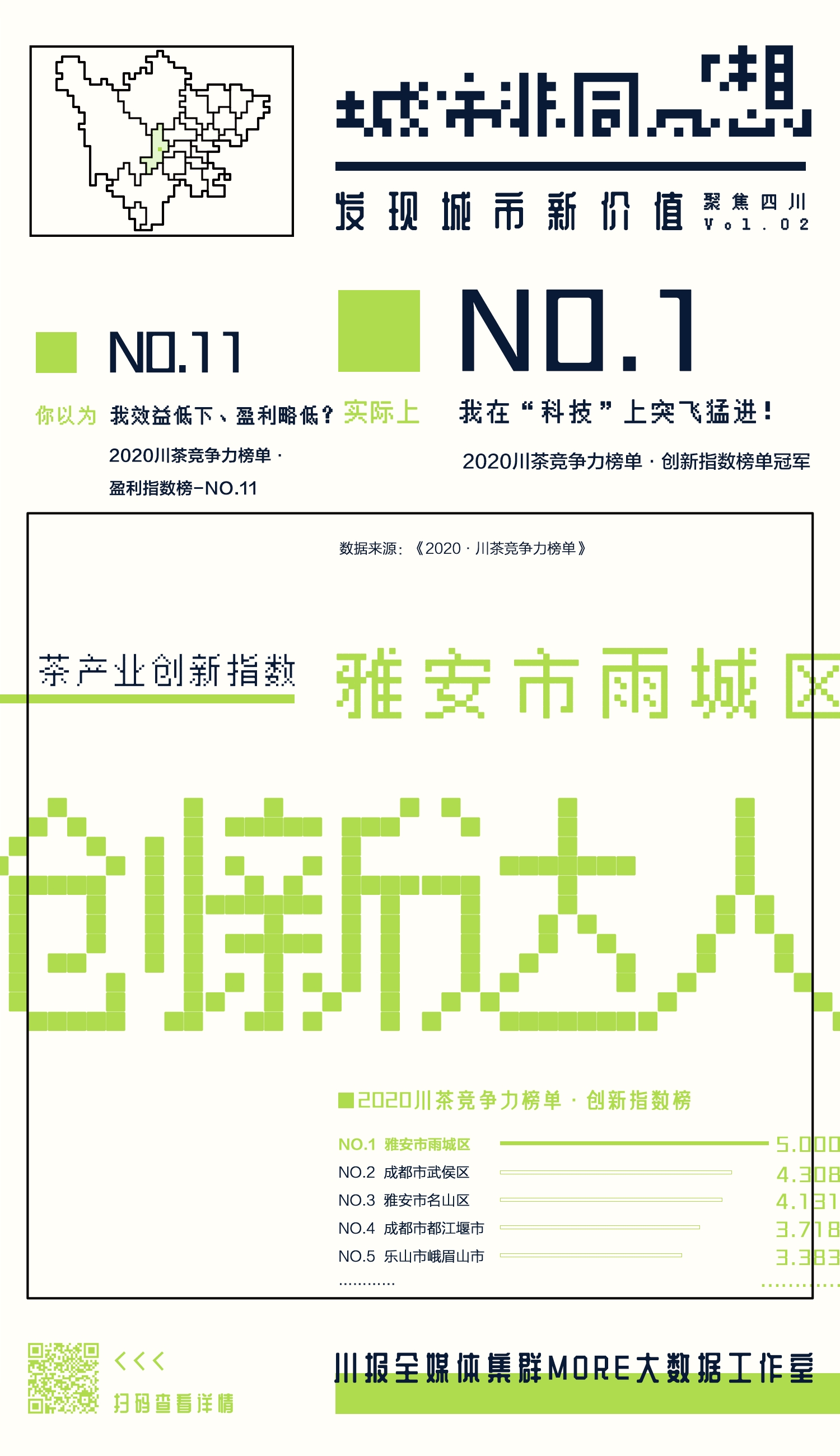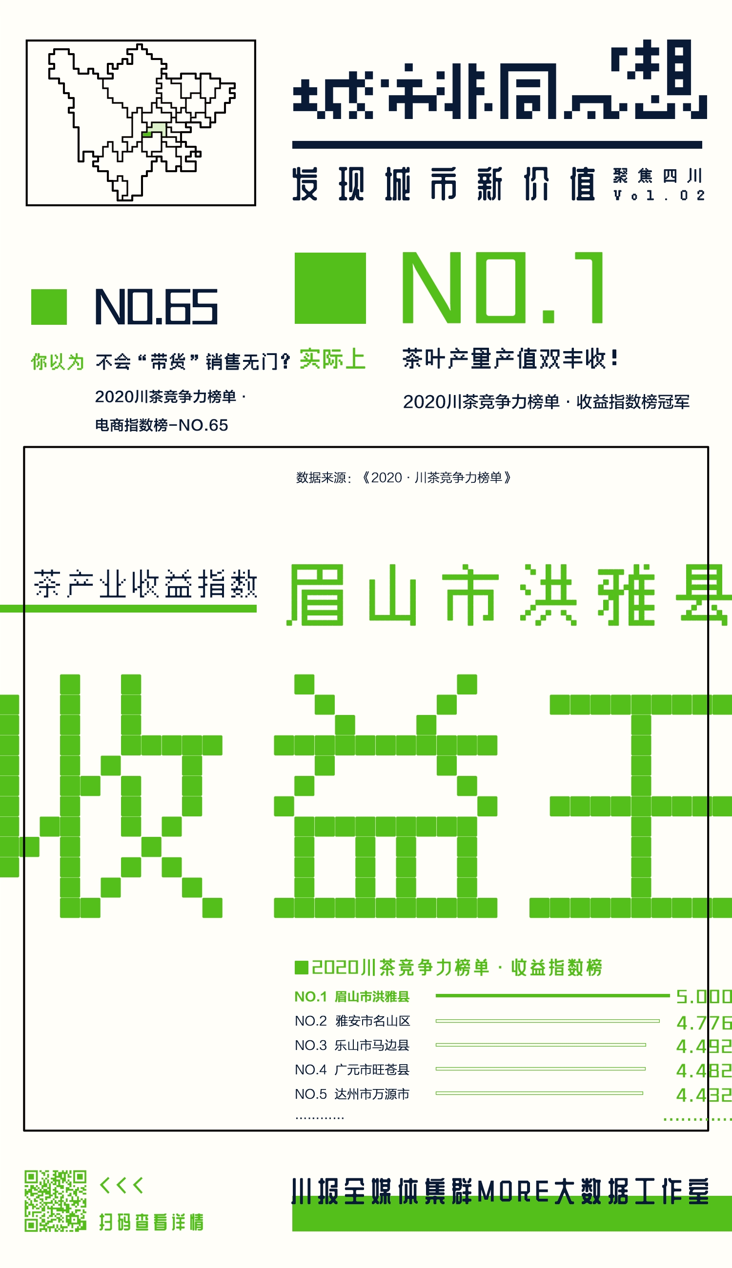 为了让大家提前“尝鲜”,特在《2020·川茶竞争力榜单》出炉之前,选出了“全料茶王”雅安名山区、“民选茶王”乐山峨眉山市、“创新达人”雅安雨城区、“品质控”宜宾高县、“优等生”成都都江堰市、“收益王”眉山洪雅县,共6个表现亮眼的茶产业优秀县(市、区),带大家品一品四川茶产/销区还有哪些让人意想不到的亮点。长按你中意的海报,识别二维码,可以获取更多信息。