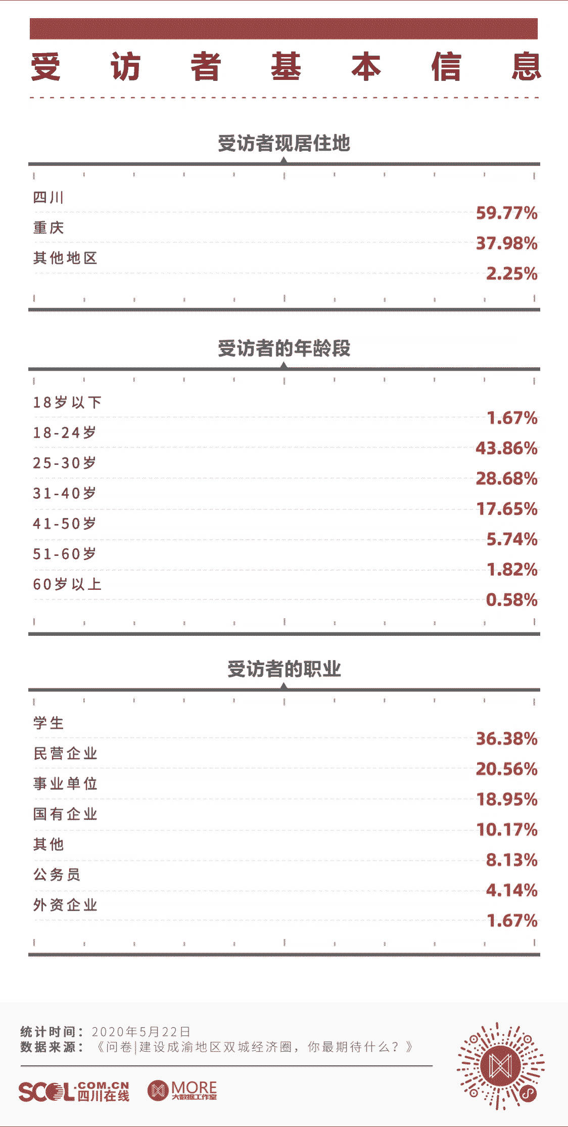 本次调查的受访者主要来自四川和重庆,其中四川受访者占比59.77%,重庆受访者占比37.98%。受访者年龄主要集中在18岁到30岁之间,占比超七成,其中18-24岁受访者占比为43.86%,25-30岁受访者占比为28.68%。可见,“后浪”们对“成渝地区双城经济圈”建设关注度更高。