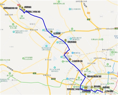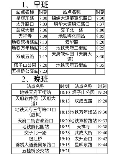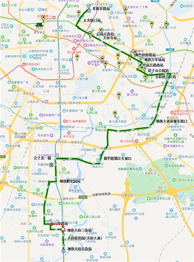 站点设置:星辉东路、太升路口、武成大街、天祥寺、地铁双桥路站、地铁万年场站、双成五路、塔子山公园、五桂桥公交站、锦绣大道菱窼东路口、锦华大道锦江路口(返程:包江桥)、交子北一路、地铁孵化园站、云华路、地铁天府三街站、天府软件园(天府大道)、地铁天府五街站。