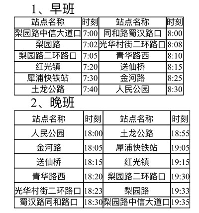 站点设置:梨园路中信大道口、梨园路、梨园路二环路口、红光镇、犀浦快铁站、土龙公路、同和路蜀汉路口(返程蜀汉路同和路口)、光华村街二环路口、青华路西、送仙桥、金河路、人民公园。