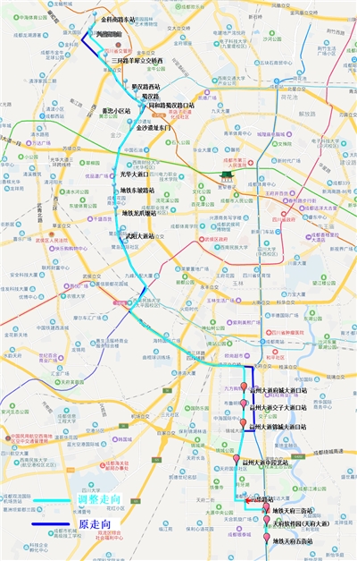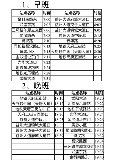站点设置:金科南路东、兴盛东路、三环羊犀立交桥西、蜀汉路西、蜀汉路、同和路蜀汉路口(返程:蜀汉路同和路口)、金沙遗址东门、光华大道口、地铁东坡路站、地铁龙爪堰站、武阳大道、益州大道府城大道口站、益州大道交子大道口站、益州大道锦城大道口站、益州大道中段北、云华路站(返程:天府二街吉泰路口站)、地铁天府三街站、天府软件园(天府大道)、地铁天府五街站。