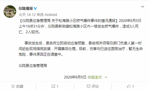 四川在线消息:6月5日,据中共仪陇县委、仪陇县人民政府官方微博消息,仪陇县应急管理局通报,5日上午10点31分许,四川省南充市仪陇县新政镇松海路小区内一楼发生燃气爆炸,造成3人死亡、2人轻伤。
