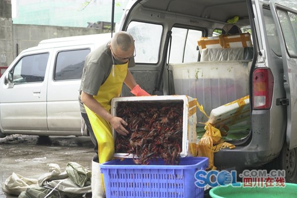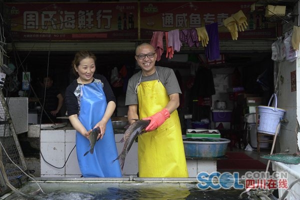 夏日初至,天色越来越长,市场里的人,开工越来越早。不到7点,一楼鲜鱼区已经有了哗哗的水声,偶而有鱼蹦到了地面,摊主便“哎呀”一声,追过去抓起来扔回水里。一辆面包车停在了45岁的刘文霞身后,她一转身,看见丈夫黄来洪提着一大筐小龙虾倒进一个大澡盆里:“周末,买小龙虾的人多。”夫妻俩来自双流,2011年将鱼摊从交子街菜市迁到光明路菜市,渐渐地熟客越来越多。大多数客人,称好斤两后说一句:“帮我杀好,买完菜来拿”。便转身上二楼买肉买菜去。