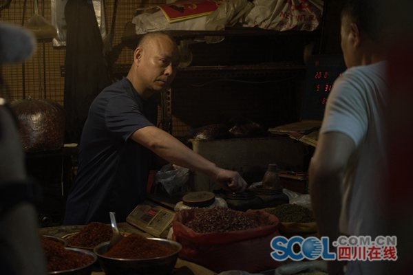 一楼亮着灯的巷道里,“咚咚咚”盅海椒面的声音,仿佛在为刘文霞一家子的幸福笑声伴奏。“海椒面,你昨天咋没摆摊?”沉醉在新鲜海椒面香气里的辜华异站起身来,踱进只容一个人转身的“资格海椒面”铺子里:“昨天星期六,每个星期六都不上班,休息一天。”从青龙场到糠市街再到光明路,卖了20多年海椒面的辜华异也算炼成了“海椒面老王子”,上门的熟客居多,甚至有人穿城而来。得闲了,已过半百的辜华异便倚在摊口的柱头上,带着一丝淡而狡黠的笑:“国营企业耍两天,我只耍一天。钱是挣不完的,该耍就耍。想开点,耍好点”巷道那头,蜂蜜铺子里的老板戳穿了他:“他不是在休息,他是在屋头炒海椒。”辜华异假装没听见,坐下来继续盅海椒面:“没得啥子独门绝技,关键是炒得好才香。关键是手工,炒的方法不一样。”