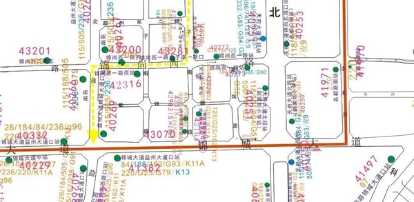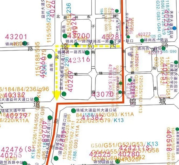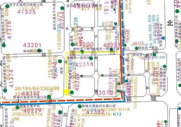 线路走向:火府城大道东段站至交子南一路锦尚西一路口行驶路线及站点不变,临时调整经锦尚西一路、益州大道后回原线行驶