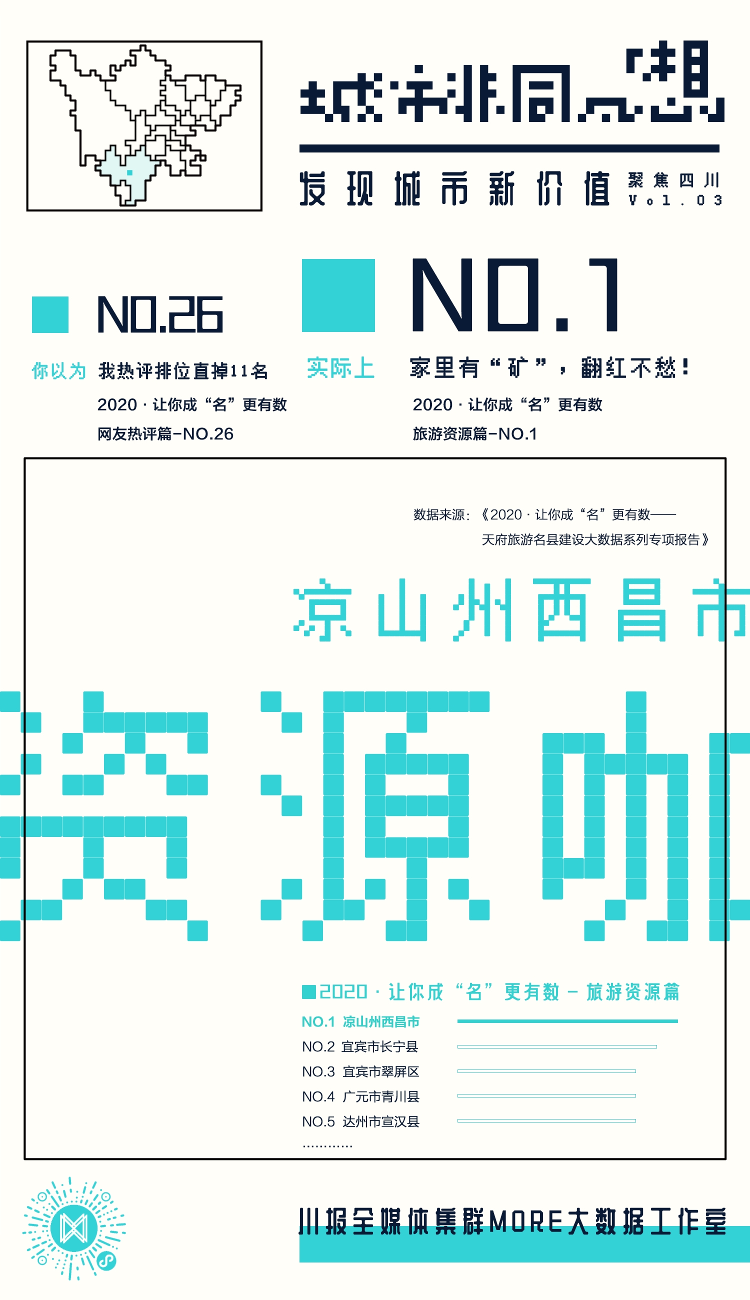 作为拥有“航天城”、“太阳城”、“月亮城”、“小春城”四张城市名片的西昌市,其实还是隐藏的文旅“资源咖”。泸山琼海,彝寨风情让这座城市充满魅力,一年一度的火把节让这座城市备受瞩目。川报全媒体集群MORE大数据工作室基于《2020·让你成“名”更有数——天府旅游名县建设大数据系列专项报告》底层数据,再度深挖数据价值,选出不同领域中表现突出的城市,推出系列文旅实力龙虎榜。今天,带大家数据画像家中景区“矿”产丰富的“资源咖”——凉山州西昌市。