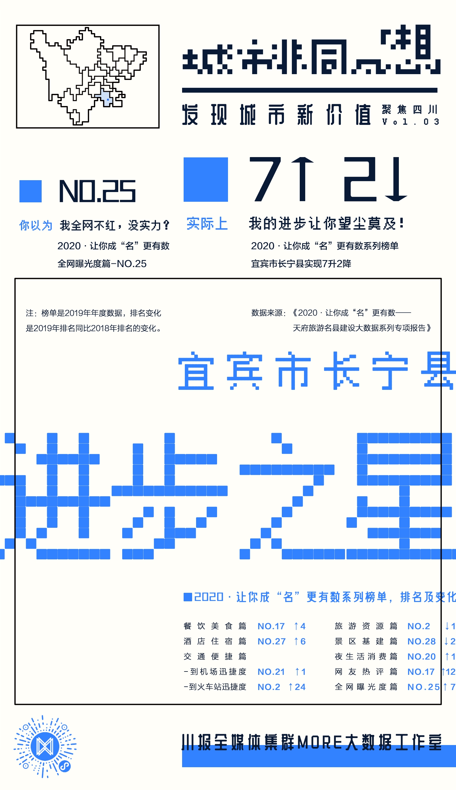 据《2020·让你成“名”更有数——天府旅游名县建设大数据系列专项报告》数据,长宁县2019年在餐饮美食、酒店住宿、交通便捷、夜生活消费、网友热评和全网曝光等7个维度都有不同程度的进步,是名副其实的“进步之星”。尤其是“到火车站迅捷度”和“网友热评度”排名进步较大,排名分别进步了24名和12名。