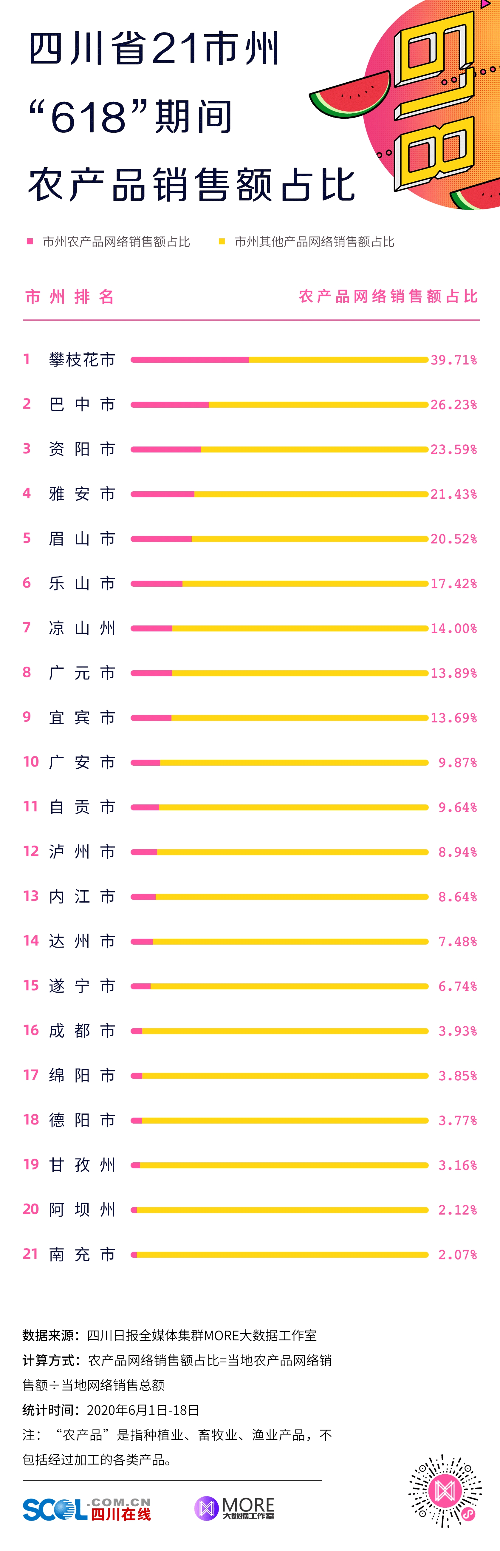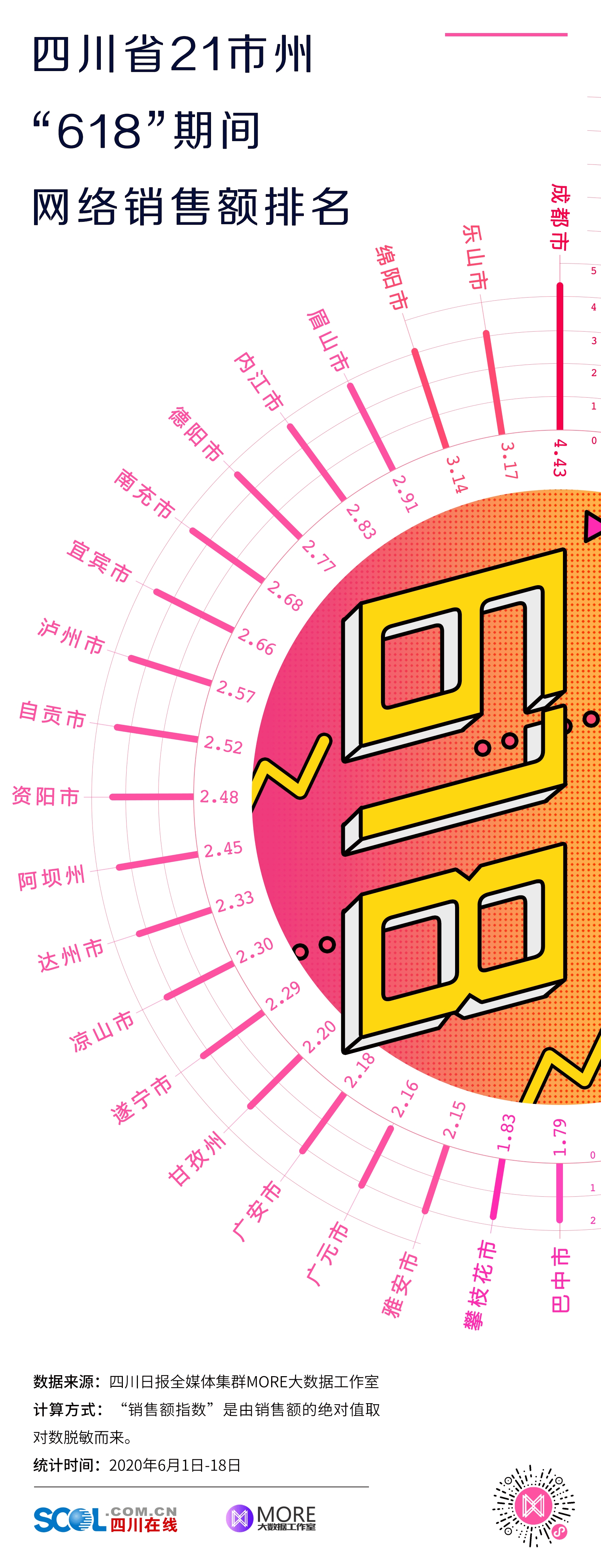作为新冠肺炎疫情防控进入常态化之后的首个大规模电商购物节“618”如约而至,刚好对4个月以来四川省“电商营商高地”建设情况进行一次考察。川报全媒体集群MORE大数据工作室,通过数据带您看哪个市州电商销量成绩最好,什么川货最有销路!