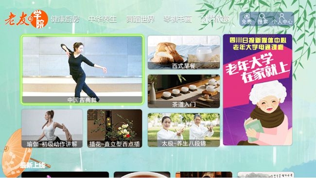 老年大学“一座难求”?特殊时期不敢大规模聚集!今后,“老年大学”在家也能上了!川报新媒体中心为中老年人群打造的电视学习平台——“老友学院”专区近日正式登陆四川移动家庭电视。课程囊括了现下各老年大学最受欢迎的课程门类,名师名家线上授课,足不出户,在家就能“上老年大学”。
