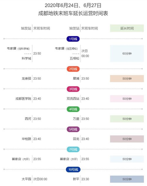 四川在线消息(记者 邓童童)2020年端午节假期(6月25日至27日)即将到来,6月23日,记者从成都地铁运营公司获悉,端午节前一天及节假日最后一天(6月24日、6月27日),成都地铁各线路将延长运营服务时间50-60分钟。