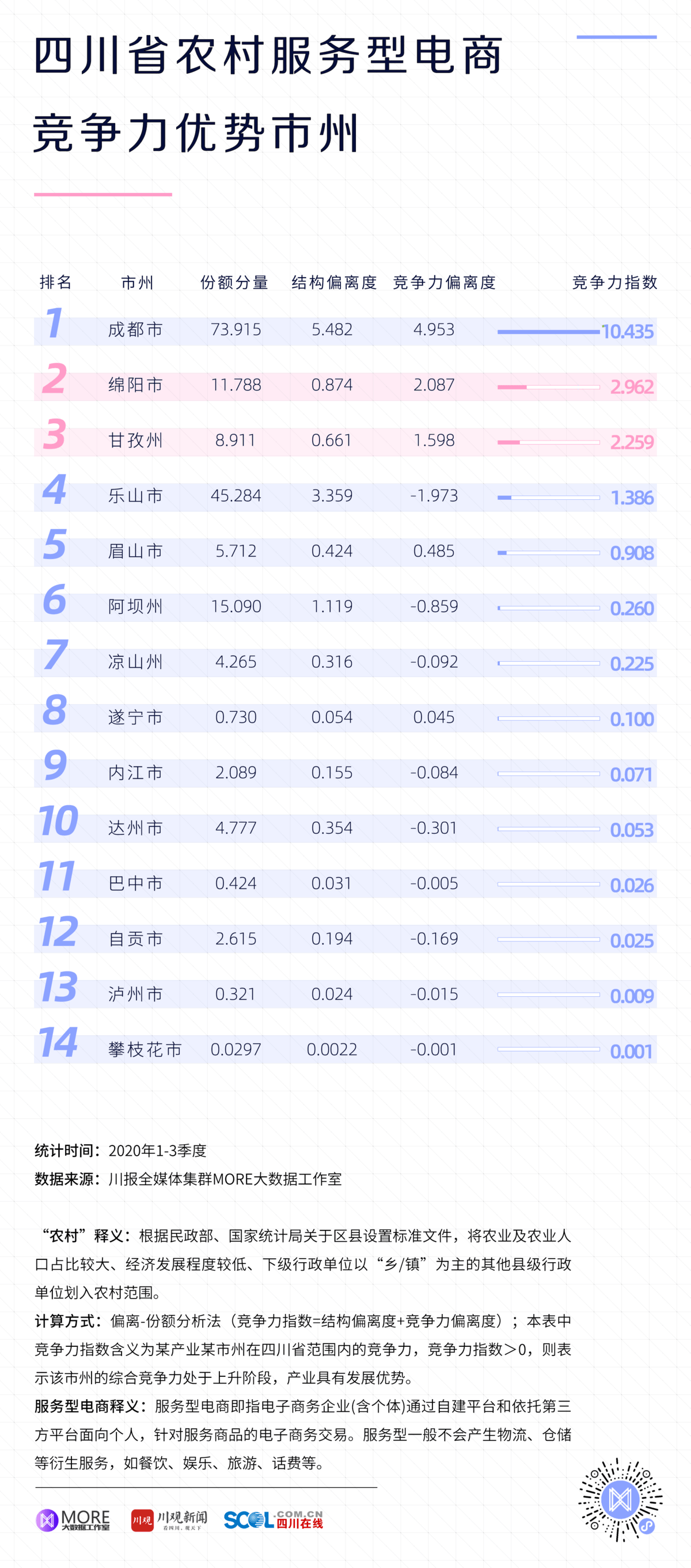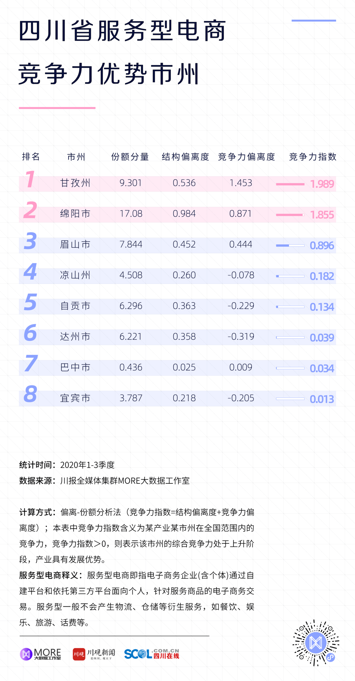 四川各市州的线上服务竞争力如何?有哪些市州的竞争力在不断提升?又有哪些市州即将成为“线上服务小巨头”?川报全媒体集群MORE大数据工作室,用数据带你看2020年前3季度四川各市州的服务型电商实力。