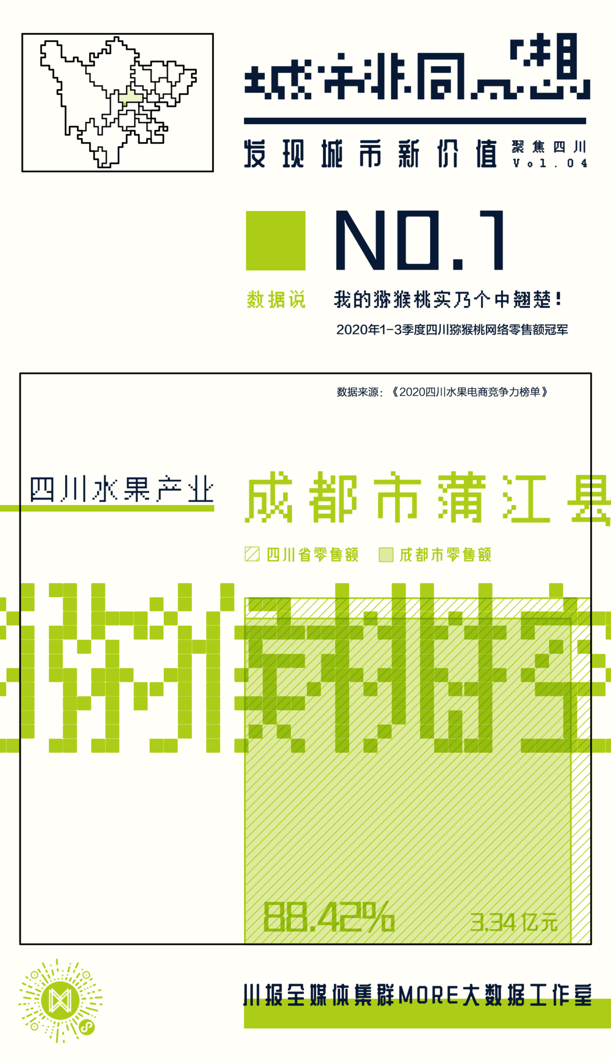 根据《2020四川水果电商竞争力榜单》数据,成都市以26.01分的高分,位居四川省水果电商产业竞争力第一位。而蒲江猕猴桃是四川省最具优势和特色的水果之一,它为成都市水果电商销售竞争力贡献了多少力量?川报全媒体集群MORE大数据工作室,基于《2020四川水果电商竞争力榜单》的底层数据,选取为四川水果网络零售区域竞争力贡献较大的区域品牌作为分析主体,为大家解开竞争力提升的“数据密码”。