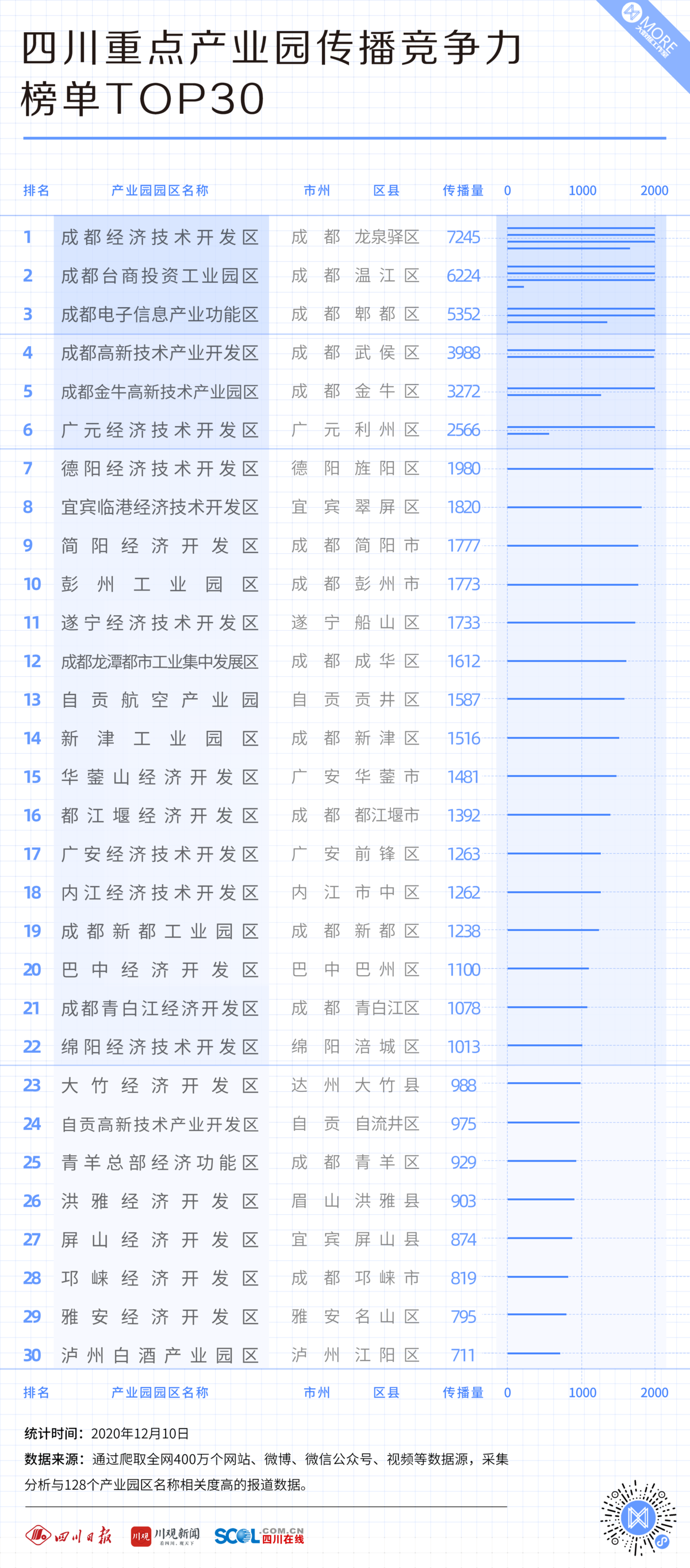 互联网的发展为产业园区提供了更广阔的品牌展示平台。产业园区可以通过网站、微信、微博等多方渠道实现产业园区内信息的共享和推广,促进园区招商和扩张。继四川日报全媒体•川观智库联合重报大数据研究院发布《2020四川重点产业园竞争力指数》报告后,再次推出《2020四川重点产业园传播竞争力榜单30强》。哪些园区传播力强、哪些渠道是园区主要传播平台?今天,就用数据带您了解谁是产业园中的品牌运营小能手。