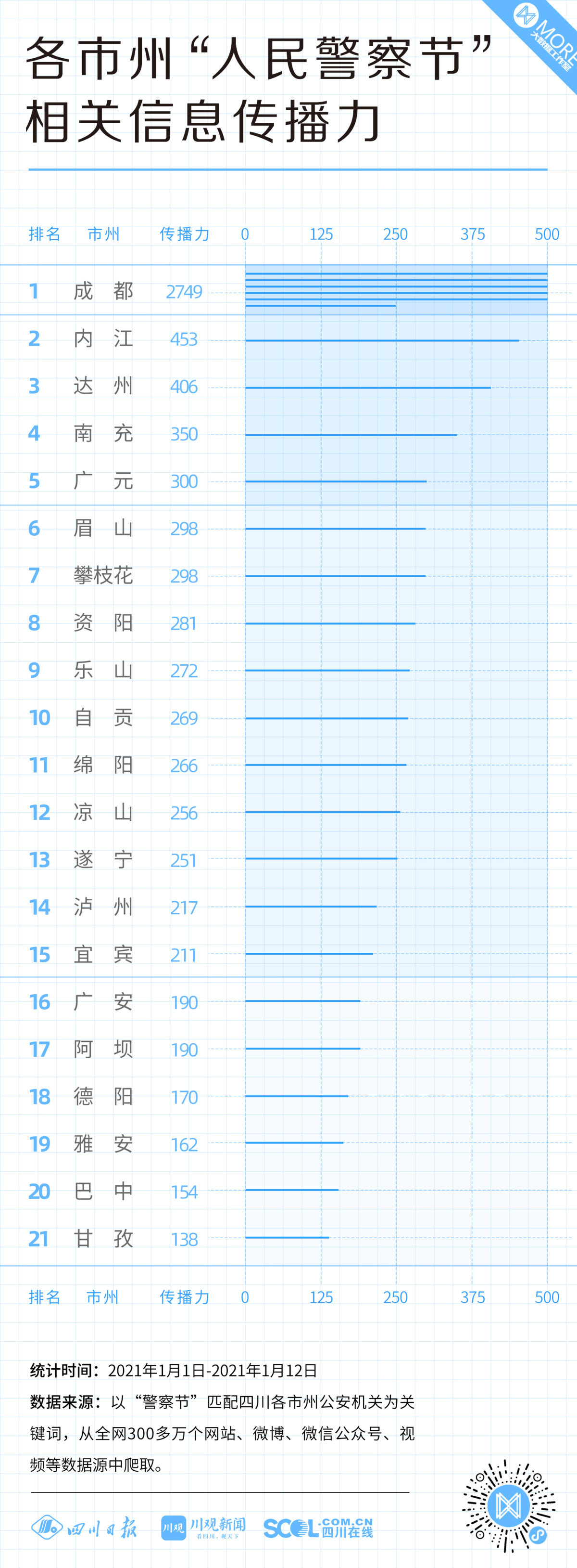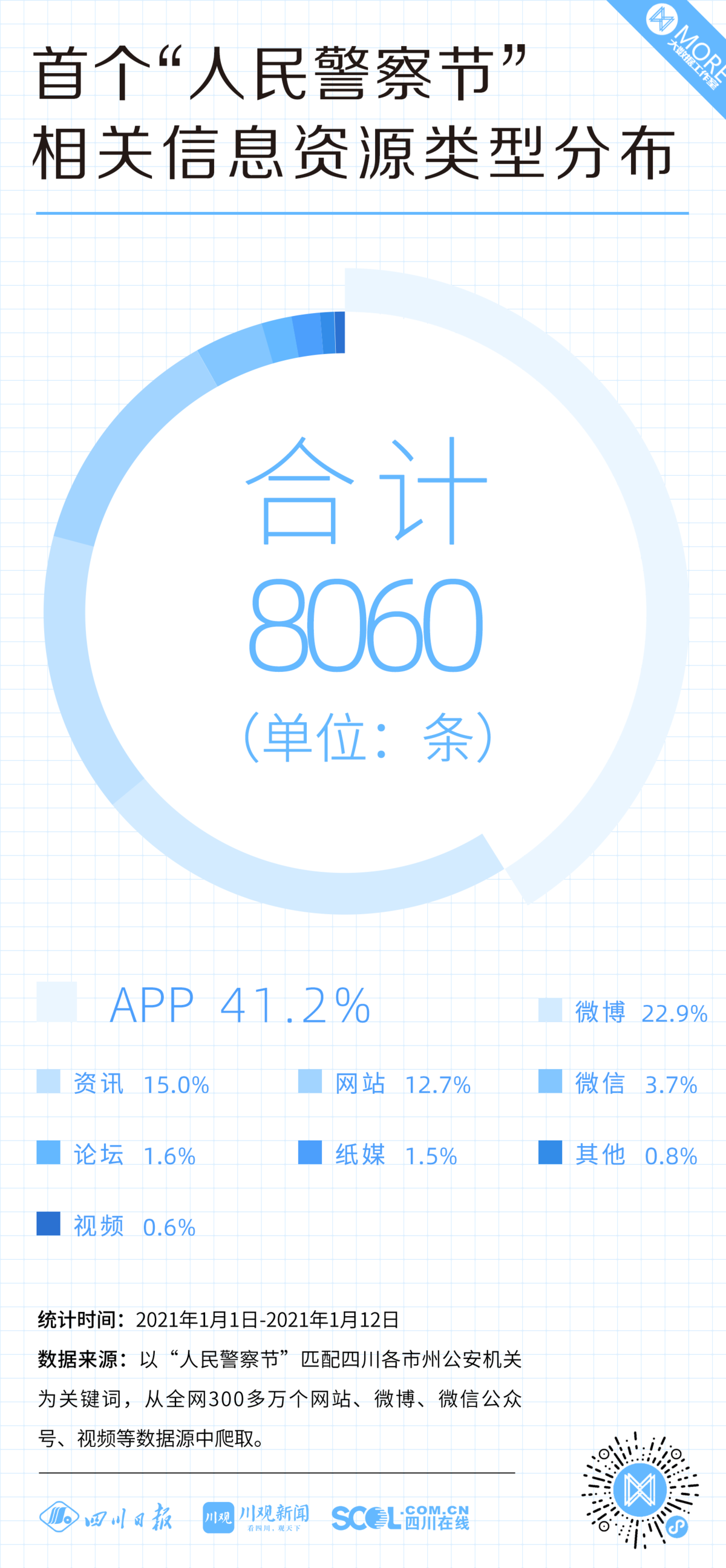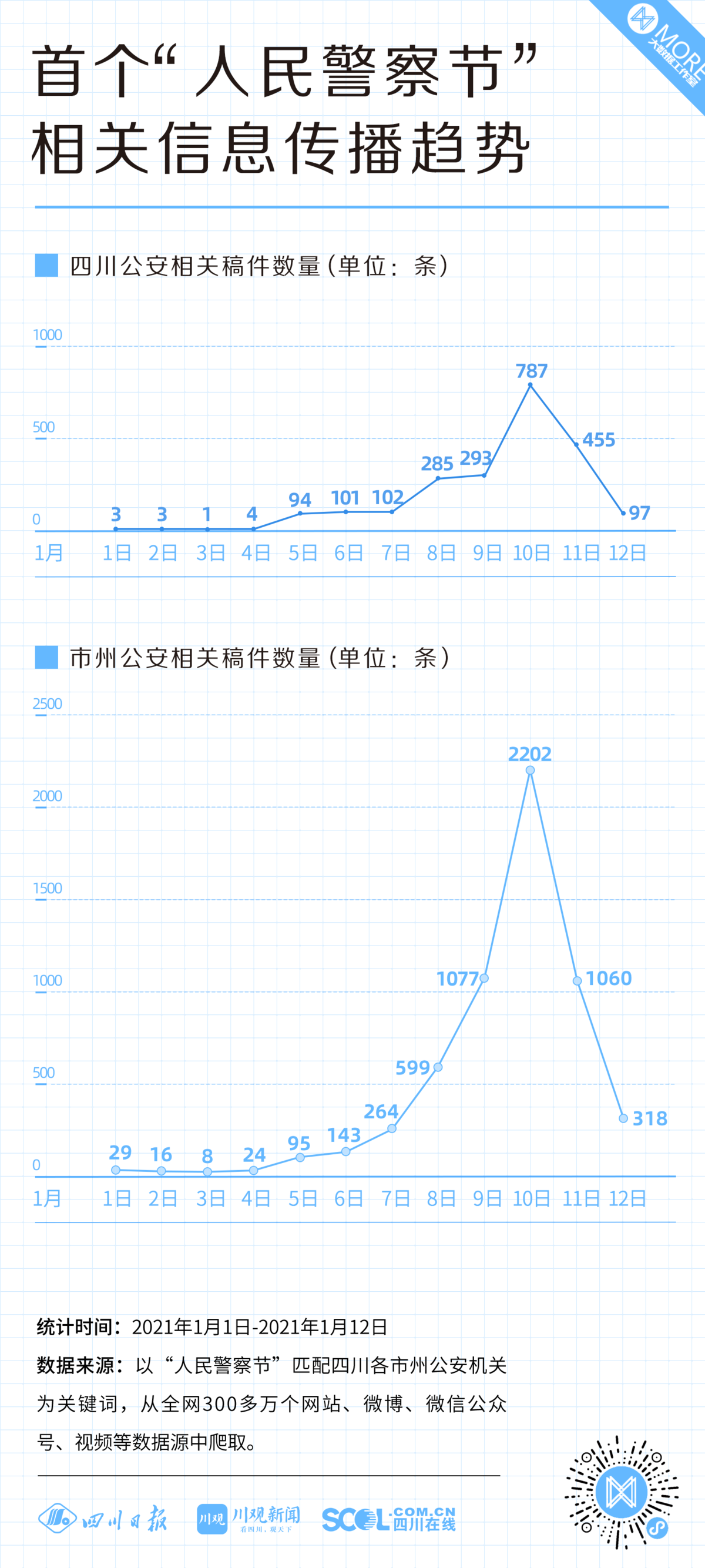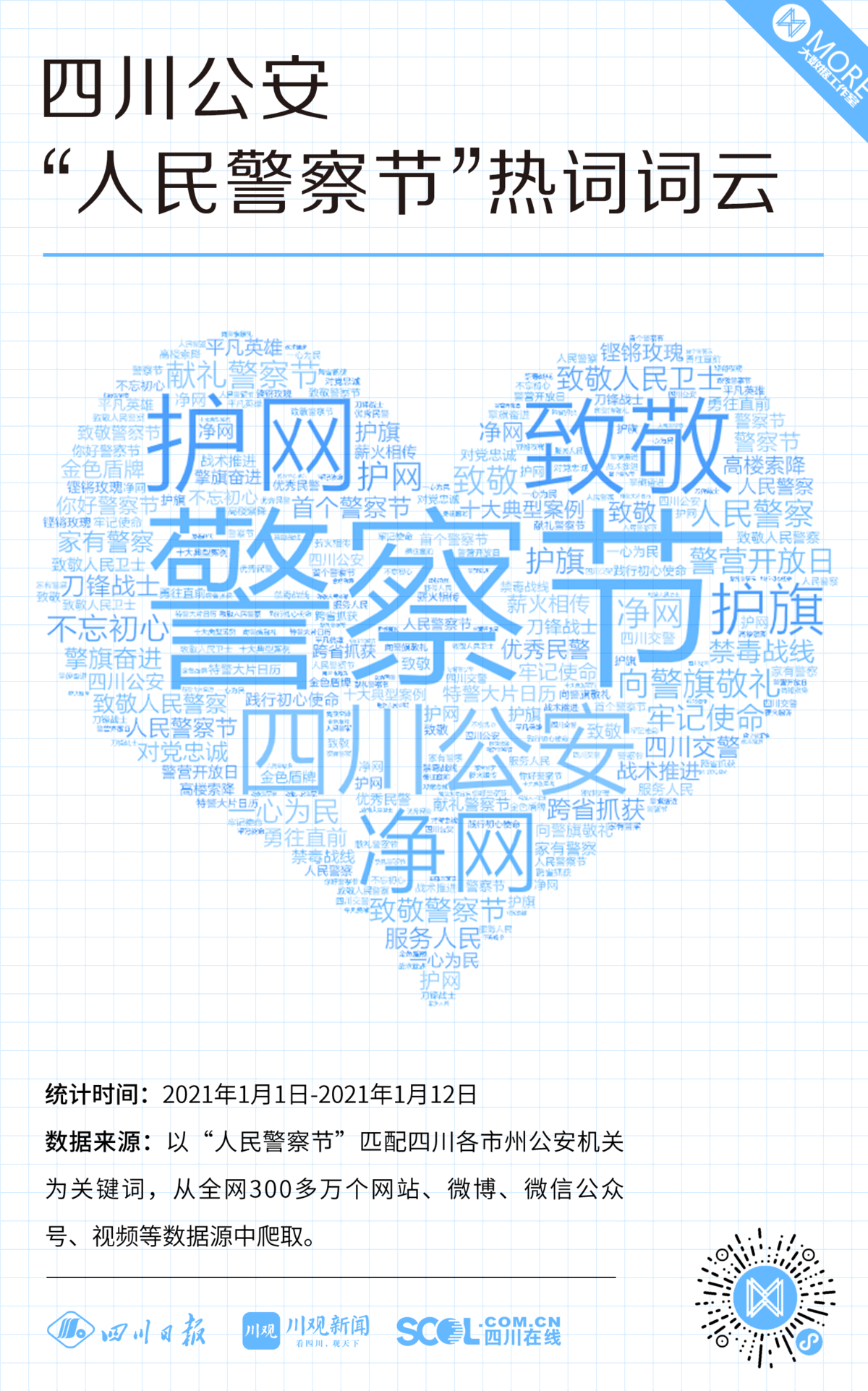 2020年7月21日,经党中央批准、国务院批复,自2021年起,每年1月10日设立为“中国人民警察节”。今年1月10日是全国首个警察节,四川公安做了哪些事?各市州的相关信息传播力如何?川报全媒体集群MORE大数据工作室从全网收集了四川公安关于“人民警察节”的上万条数据,“数”说首个警察节,四川公安的传播力!