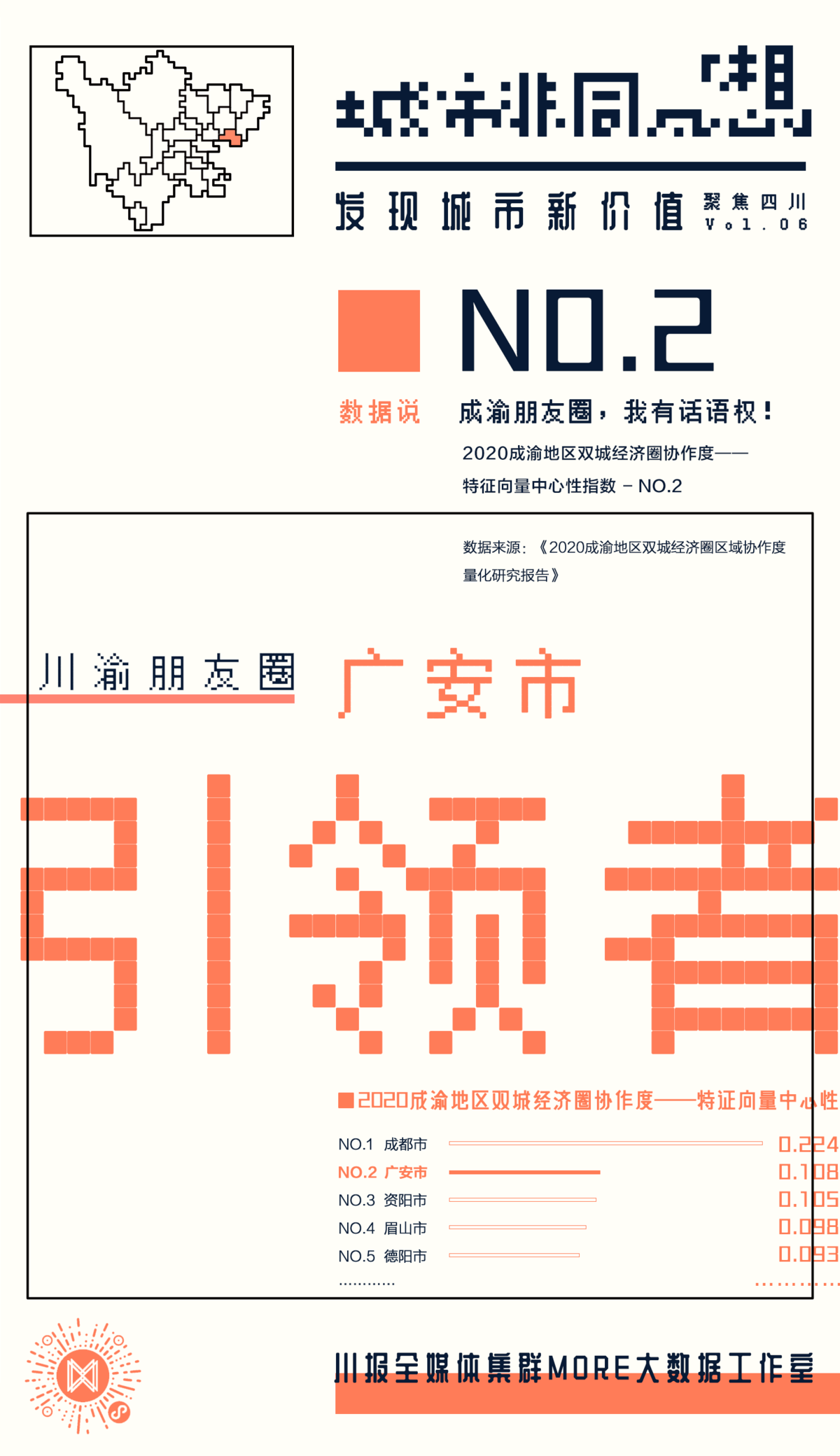 川报全媒体集群MORE大数据工作室联动川报广安全媒体中心,通过《2020成渝地区双城经济圈区域协作度量化研究报告》中的数据、算法,带你了解广安的点度中心性为何位于川渝城市前列,成为“朋友圈”中的引领者。