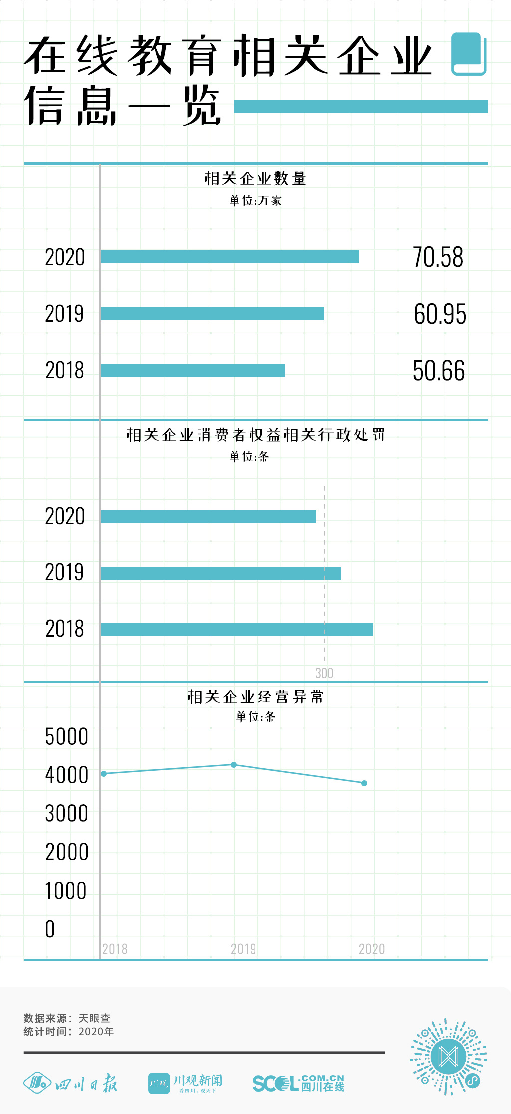 与高速增长的融资规模不同的是,2018到2020年三年间,在线教育行业对应的与消费者权益相关的行政处罚则逐年略微减少,2020年在线教育企业涉及经营异常的数字相比2019年也有明显下降。