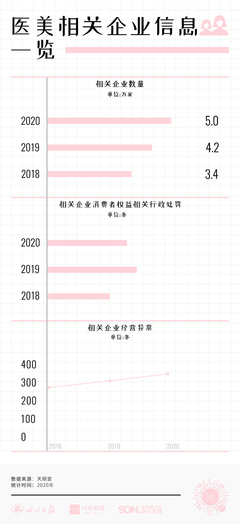 2018年至2020年全国医美相关企业分别为3.4万家、4.2万家、5.0万家,呈稳步上升趋势。而根据之前天眼查发布的《颜值升级避坑指南》,医美行业涉及虚假宣传和资质问题的现象较为常见,约10%的医美企业曾受到行政处罚。
