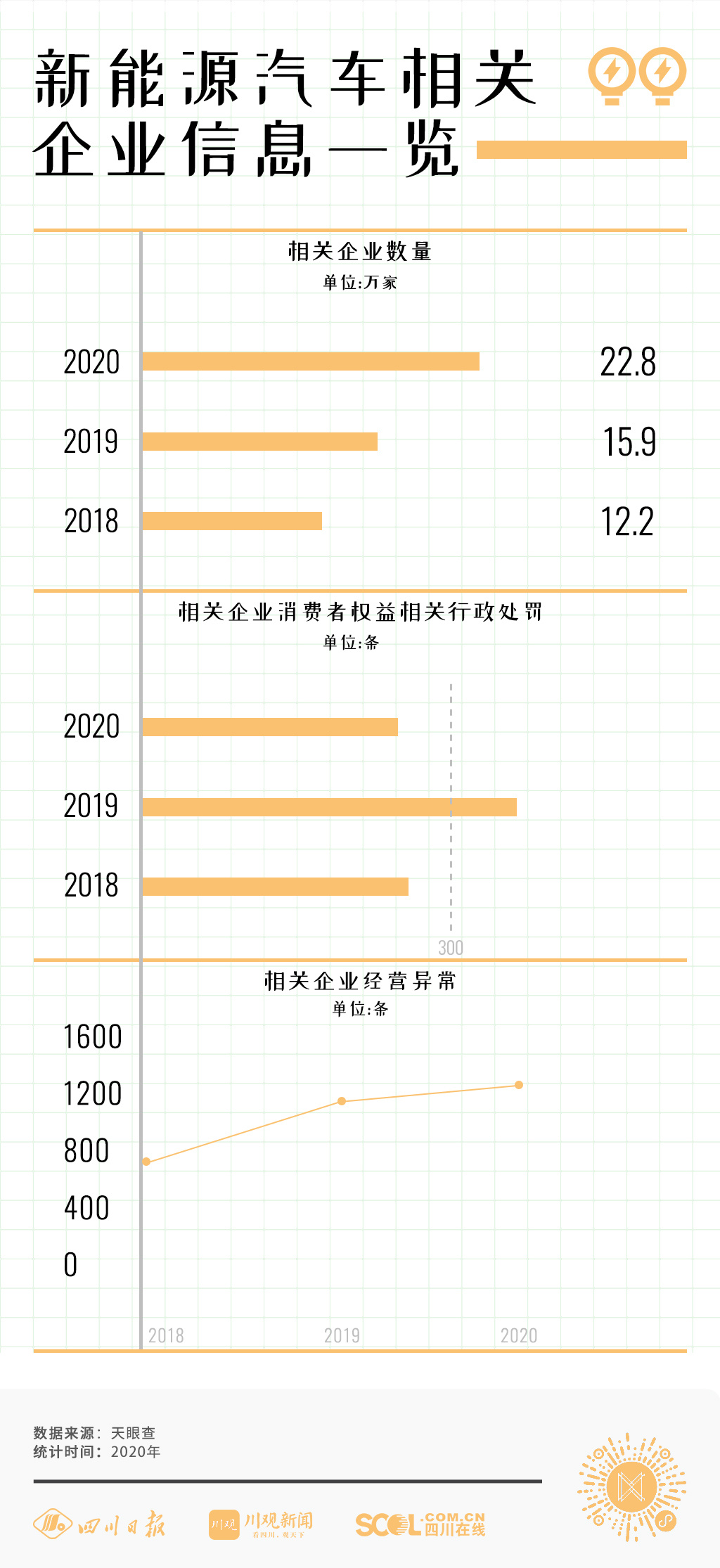 2018年到2020年,全国新能源汽车相关企业分别为12.2万家、15.9万家、22.8万家,增长势头强劲。三年间,新能源汽车相关企业经营异常分别为788条、1186条、1310条,逐年递增。而2020年新能源汽车行业涉及消费者权益的行政处罚相比2019年有所减少。