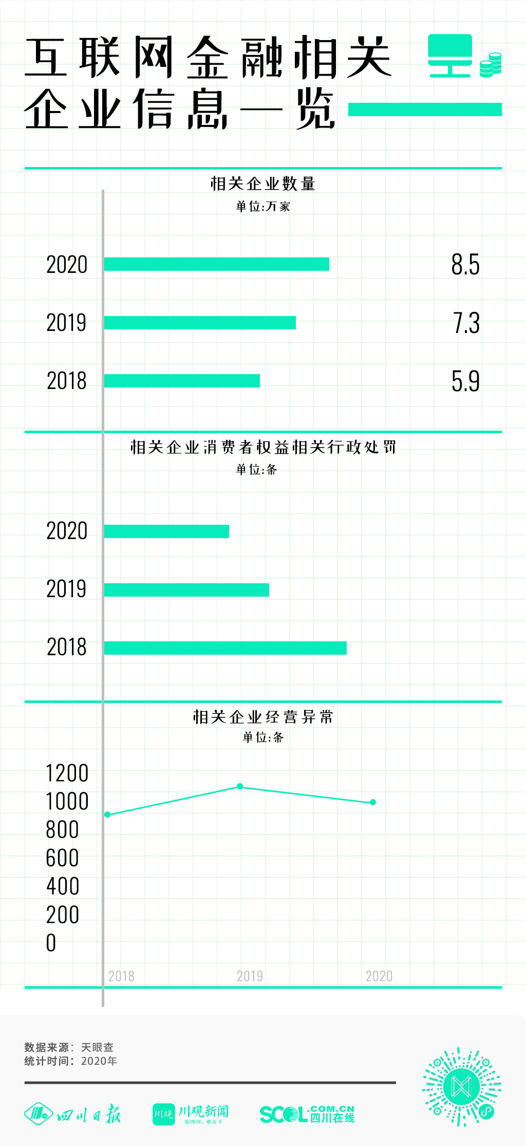 互联网金融的高速发展让消费金融快速渗透至普通消费者。2018年至2020年年间,互联网金融相关企业分别为5.9万家、7.3万家、8.5万家,呈现增长态势。