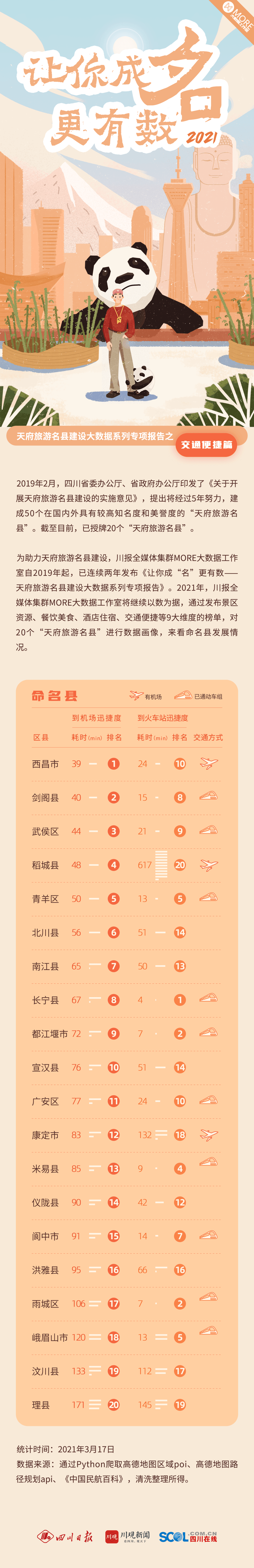 2021年3月24日,中共四川省委办公厅、四川省人民政府办公厅发布的《关于进一步做好天府旅游名县建设工作的通知》指出,要发展智慧交通、共享交通,打通断头路、做大辐射圈、提升通畅性,构建“快进、慢游、易出”的县域旅游综合交通网络。截至2021年3月17日,已有12个命名县开通动车组列车。《2021·让你成“名”更有数》榜单数据同比去年,20个天府旅游名县的航空和铁路交通耗时较去年有所缩短。