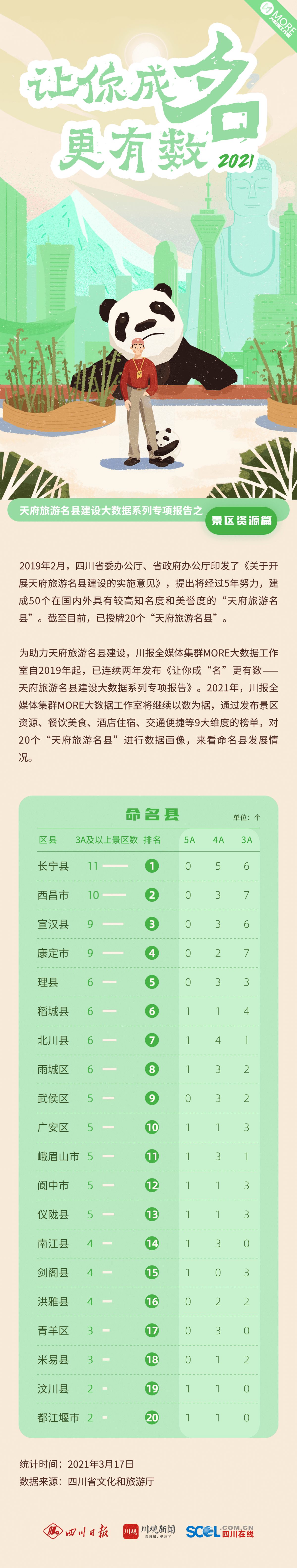 为助力天府旅游名县建设,川报全媒体集群MORE大数据工作室自2019年起,已连续两年发布《让你成“名”更有数——天府旅游名县建设大数据系列专项报告》。2021年,川报全媒体集群MORE大数据工作室将继续以数为据,通过发布景区资源、餐饮美食、酒店住宿、交通便捷等9大维度的榜单,对20个“天府旅游名县”进行数据画像,来看命名县发展情况。