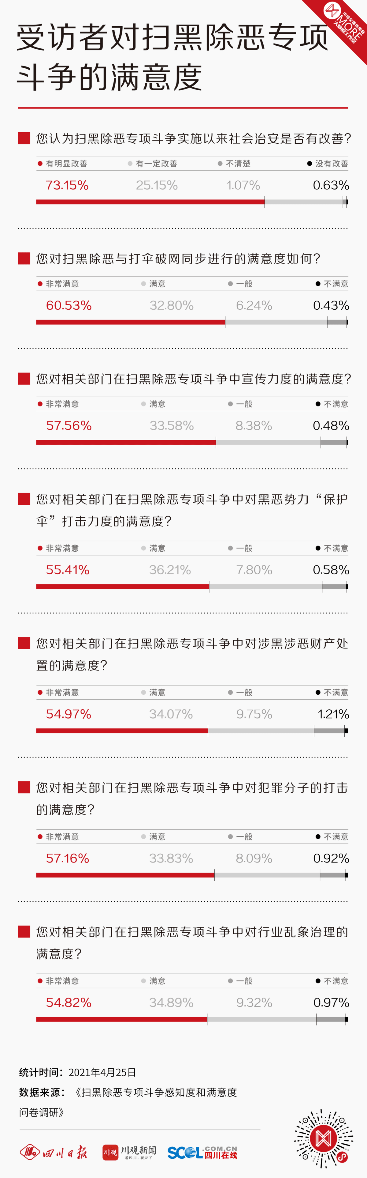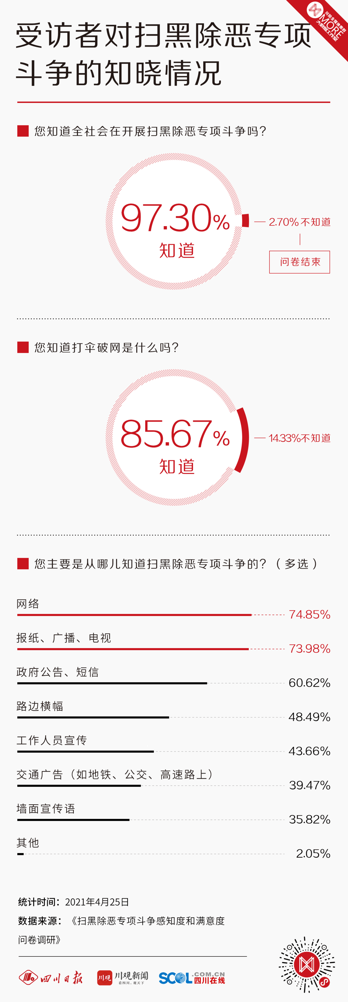 此次调查从2021年4月1日开始,截至4月25日,共收回2638份问卷,通过清洗整理后获得有效问卷2109份,一定程度上反映了普通网友对扫黑除恶专项斗争的感知和满意度情况。网友们“评卷”结果如何?往下看!