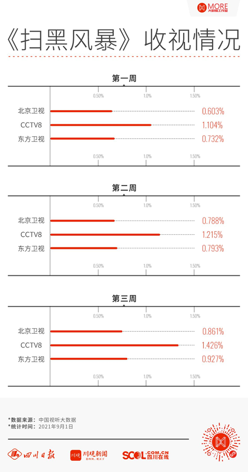 从播放平台和渠道来看,电视剧《扫黑风暴》三台一网同步四联播,网络平台和电视台播放双管齐下。8月9日上线东方卫视、北京卫视,并在腾讯视频同步播出;8月12日,CCTV-8央视八套黄金档播出。开播三周,电视台收视率持续飙升,并在第三周达到开播以来的收视最大值。