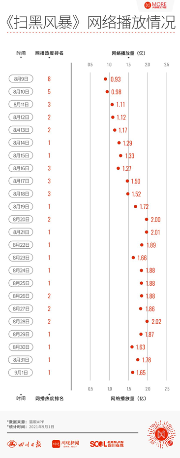 从网络播放热度来看,首播当日《扫黑风暴》暂未吸引太多观众的注意力,热度排名仅排至第8名。8月14日《扫黑风暴》登顶网播热度。8月9日至9月1日,《扫黑风暴》共12天位居网络播放热度榜第一,日均网络播放量达1.58亿。
