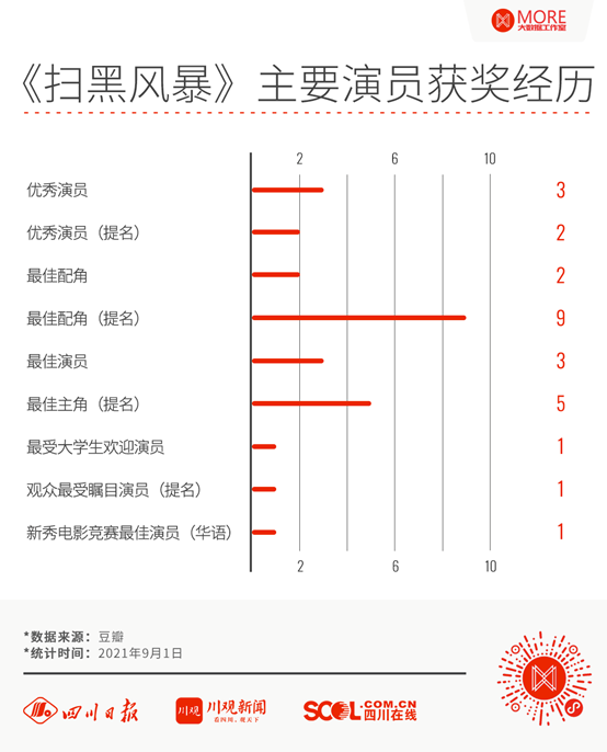 《扫黑风暴》是由孙红雷、刘奕君、张艺兴领衔主演,吴越、江疏影、王志飞、宁理等加盟。从主要演员获奖经历可以看出,《扫黑风暴》演员阵容实力强劲。主要演员获奖经历颇丰,曾获得过优秀演员奖3次、最佳配角奖2次、最佳演员奖3次。其中,最佳配角提名奖次数最多,共9次。