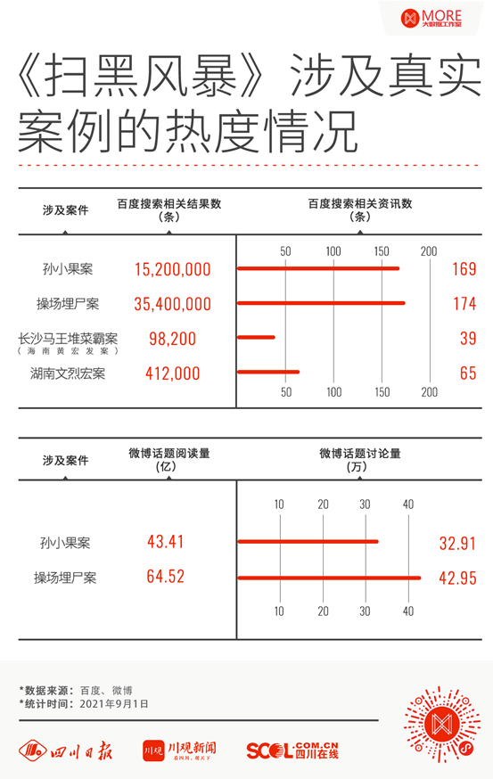 《扫黑风暴》剧情取材于扫黑除恶专项斗争过程中的真实案例,分别以孙小果案、操场埋尸案、长沙马王堆菜霸案和湖南文烈宏案为蓝本制作拍摄。在剧集播放过程中,涉及的真实案例也不断被网友重新提起。这些案例自带热度流量,如“操场埋尸案”百度搜索出来有354万条相关信息,微博话题阅读量达64.52亿,话题讨论量达42.95万。
