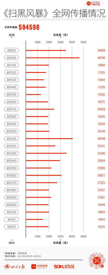 清博舆情数据显示,截至9月2日,《扫黑风暴》在全网的信息总量达到594598条。电视剧播出前期相关报道和信息较多,首播第二日全网信息量达到峰值,共计46786条。