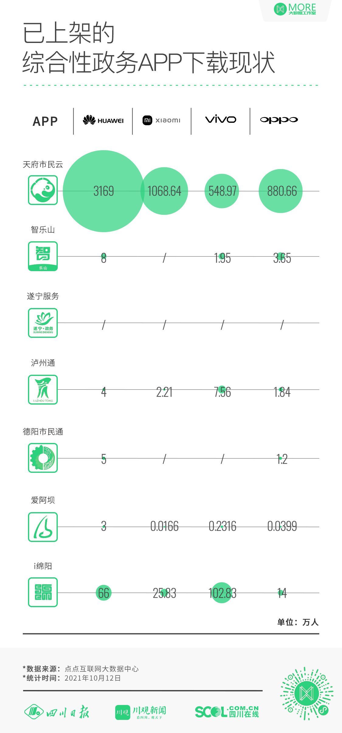 成都市牵头开发的天府市民云,因汇聚了眉山和资阳频道,且功能完善使用率较高,下载量遥遥领先。遂宁市人民政府出品的“遂宁服务”仅在苹果应用商城上架,故其余国产手机应用市场下载量为0。