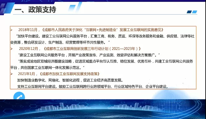 2020年12月,出台了《成都市工业互联网创新发展三年行动计划(2021-20213年)》,同时在2021年1月配套出台了十条《成都市加快工业互联网发展支持政策》,支持工业互联网平台建设,鼓励互工业互联网跨行业跨领域平台、行业区域特色平台、企业平台建设。