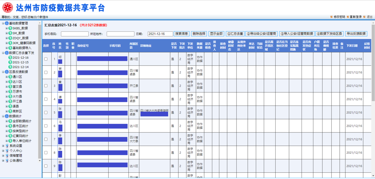 在此构想上,集大数据应用与智能分析手段为一体的达州市防疫数据共享平台上线,将分散在部门单位、机场车站、运营商等渠道的人员流动、移动轨迹等数据整编“上云”,实现自由导入、归口识别、清洗排查。截至目前,汇集疫情相关数据43.8万条。通过对涉疫涉达州数据进行自动筛选、精准对比和分类统计,调动数据“跑路”,定向推送涉疫人员轨迹数据10.3万条,提前掌握重点人员信息8386条。平台的建设运行不仅减少了人员配置,数据录入后的自动汇总、自动转交、自动去重、自动下发、一键反馈功能还大幅降低了数据汇总梳理时间,使定位分析准确度提升10%,信息处理效率提升30%以上,全面畅通达州市防疫工作全流程链条。
