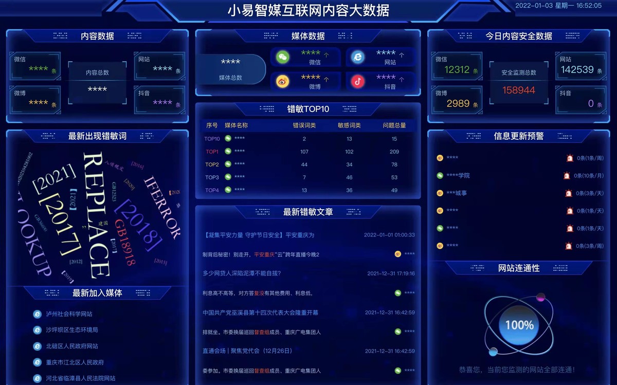 用户互联网内容经过“小易智媒”智能化词库监测后,一旦出现涉嫌违规违法内容,平台将通过微信、短信、邮件和后台可视化等方式预警通知,协助工作人员对预警信息进行整改处理。以某直辖政府网站和政务新媒体运用情况为例,“小易智媒”为超过100个政府网站和政务新媒体预警提醒错敏信息超过10万条,在线办事和信息公开不规范信息超过1万条。同时采取7×24小时智能云服务和24小时人工值守服务相结合的方式,确保数据实时整编上传,保障平台高效运转。