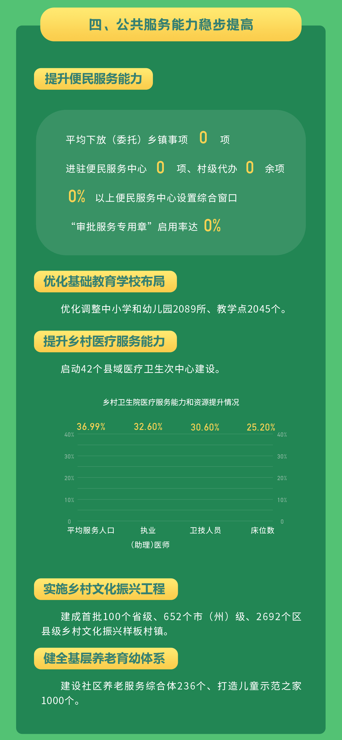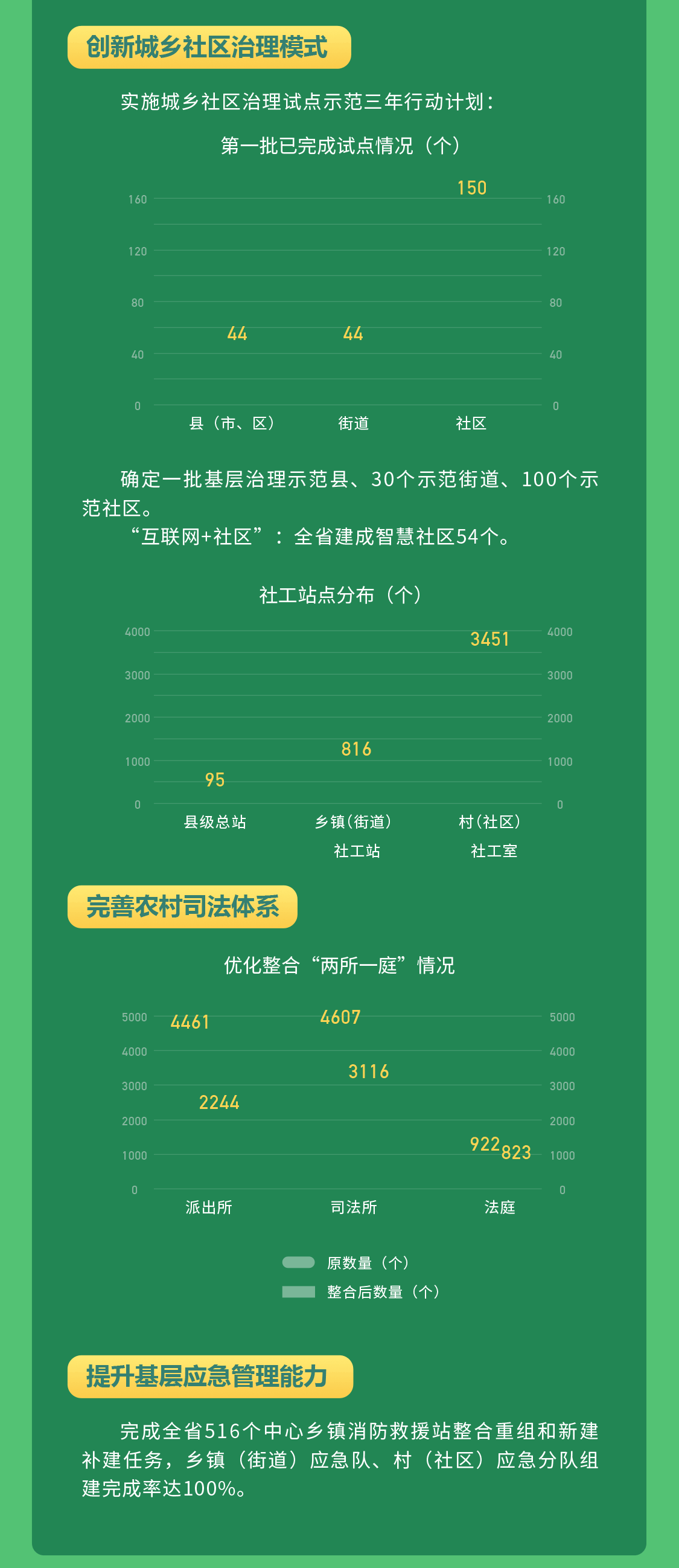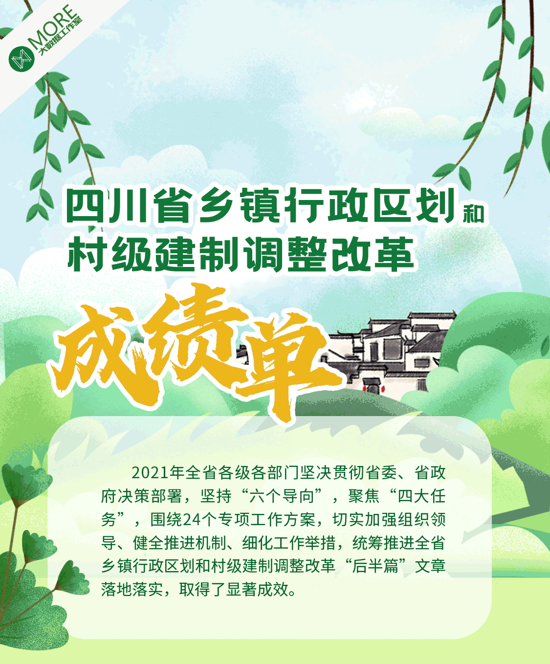 乡镇行政区划和村级建制调整两项改革是近年来四川涉及范围最广泛、群众最关注、影响最深远的重大基础性改革之一。通过改革,全省乡镇(街道)减少1509个、减幅32.7%;建制村减少18429个、减幅40.55%;村民小组减少153713个、减幅39.8%;优化新增社区457个、增幅5.9%,实现了县域空间结构、政权体系、治理架构的历史性重塑。