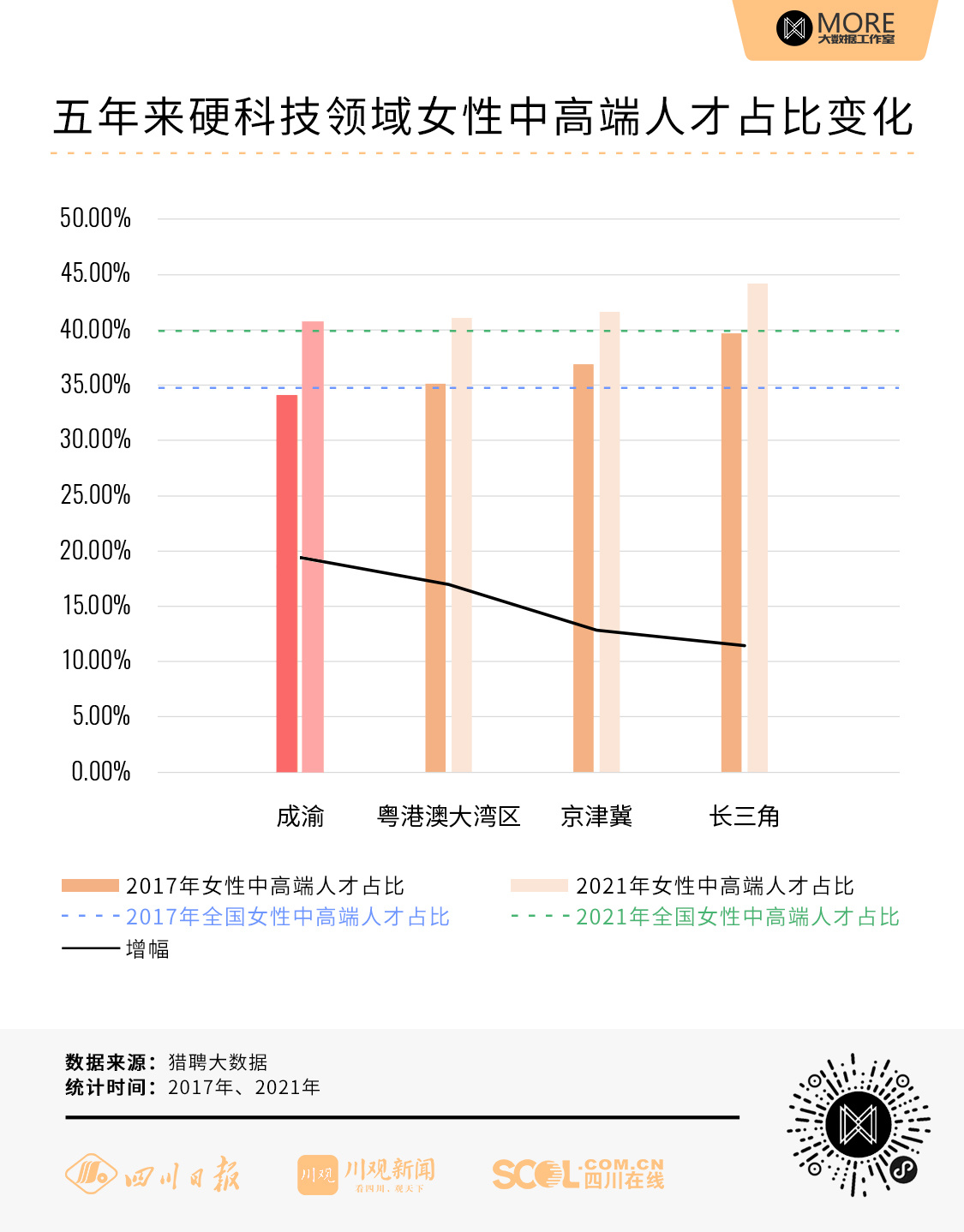 根据猎聘大数据,2017年成渝地区硬科技领域中女性中高端人才为34.12%,低于全国平均水平。2021年,成渝地区硬科技领域中女性中高端人才占比为40.74%,增幅为19.40%,幅度为全国最高。