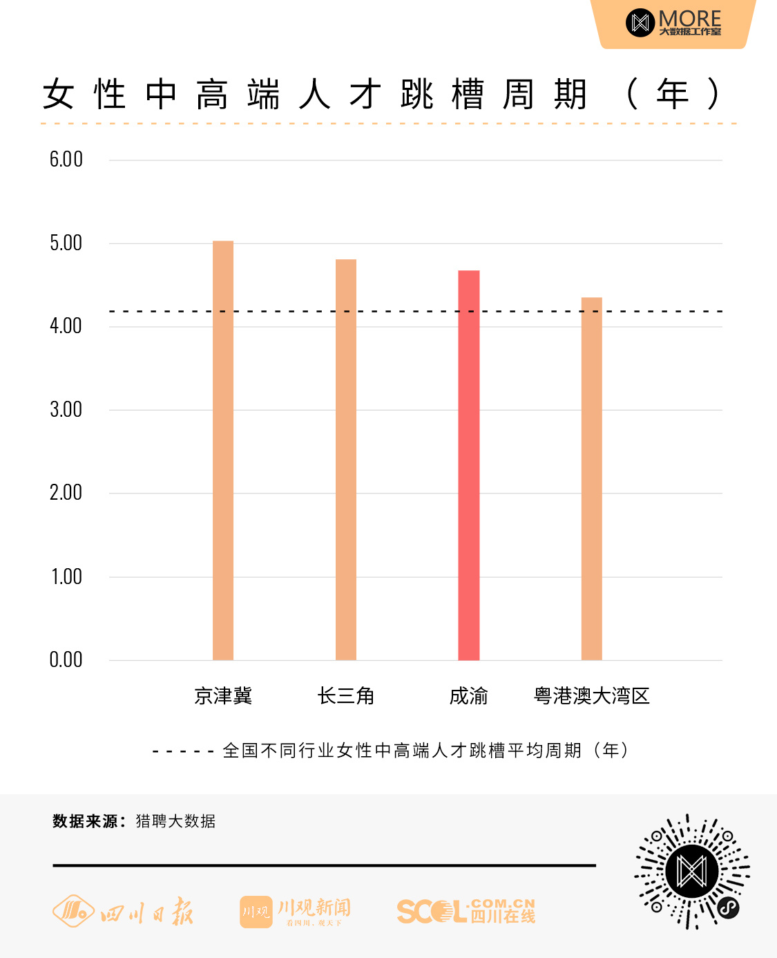 从女性中高端人才跳槽平均周期来看,成渝女性中高端人才跳槽周期为4.67年,比长三角、京津冀城市群职场女性跳槽更频繁。