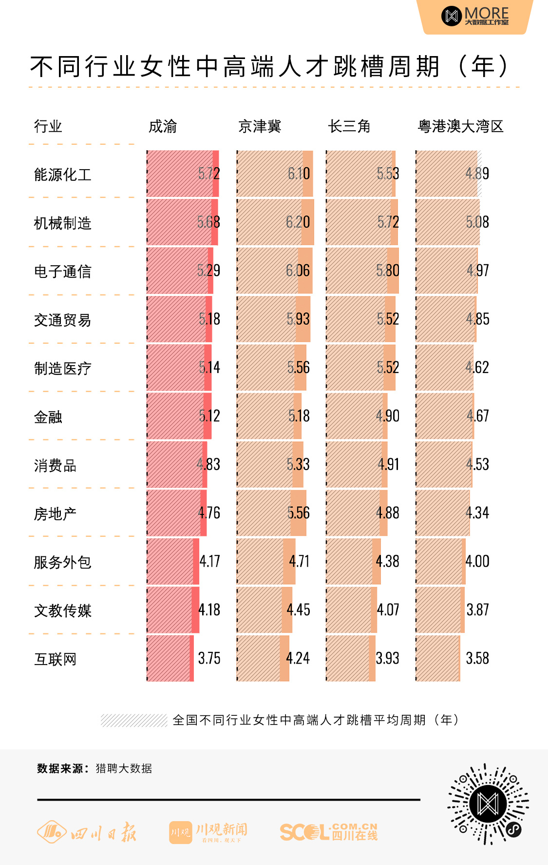 互联网是跳槽最频繁的行业,该行业的全国平均跳槽周期为3.43年,京津冀、长三角、粤港澳大湾区、成渝地区的平均周期分别是4.24年、3.93年、3.58年、3.75年,均属各城市群行业中跳槽周期最短的行业。