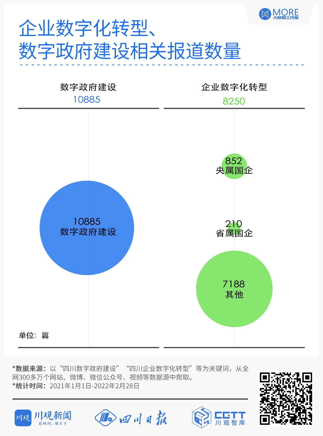 通过对全网300多万个新闻APP、网站、微博、微信公众号等数据源的爬取,2021年1月1日至2022年2月28日期间,与“四川数字政府建设”“四川企业数字化转型”相关的公开报道共18530篇,其中,与“四川数字政府建设”有关的报道数量为10885篇,“四川企业数字化转型”有关的报道共8250篇(两者有重合)。企业侧的8250篇报道中,四川央属国企、省属国企相关信息占比分别为10.32%、2.54%,发布信息多围绕“新服务”“数字化转型促进中心”“数字化转型方案”“一带一路”“双碳”等内容展开。
