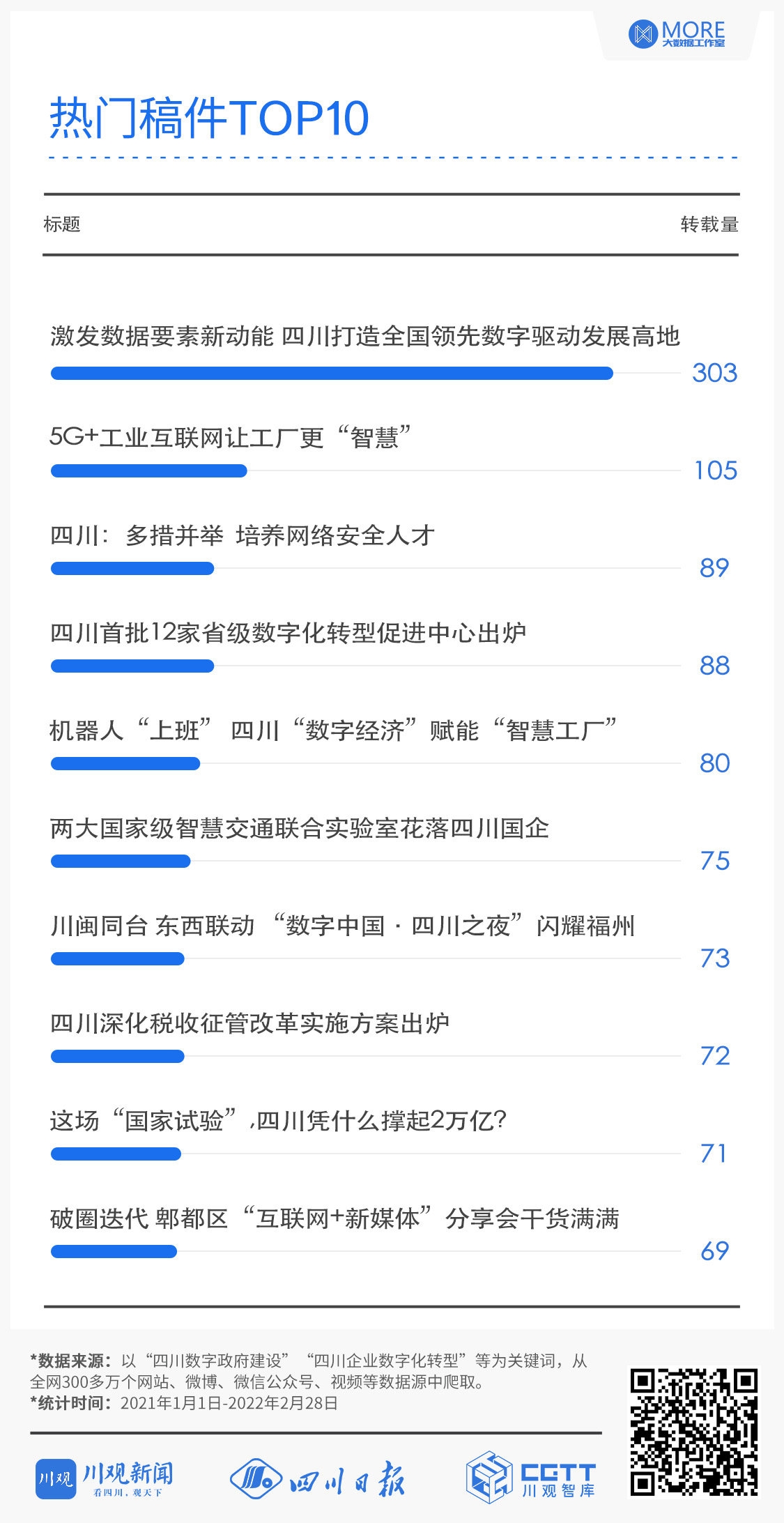 通过稿件转载量数据来看,《激发数据要素新动能 四川打造全国领先数字驱动发展高地》被转载次数最多,共计303次。总体来说,与“智慧赋能”“互联网+”、数字四川等相关的内容,受到更广泛的关注,传播情况更好。
