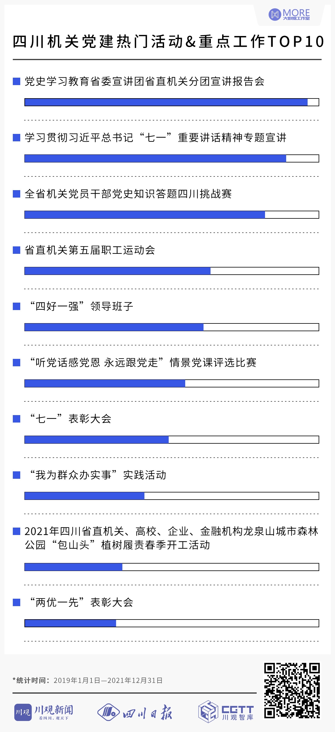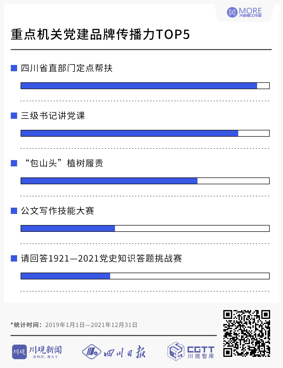 近年来,四川省直各部门(单位)结合自身优势、特点以及四川地域特点,成功打造多个能够代表四川机关党建形象、展现四川机关党建良好风貌的品牌活动。通过数据分析发现,2019年-2021年间传播力最好的五个品牌活动分别是“定点帮扶”“三级书记讲党课”“包山头”植树履责、公文写作技能大赛和“请回答1921—2021”党史知识答题挑战赛。