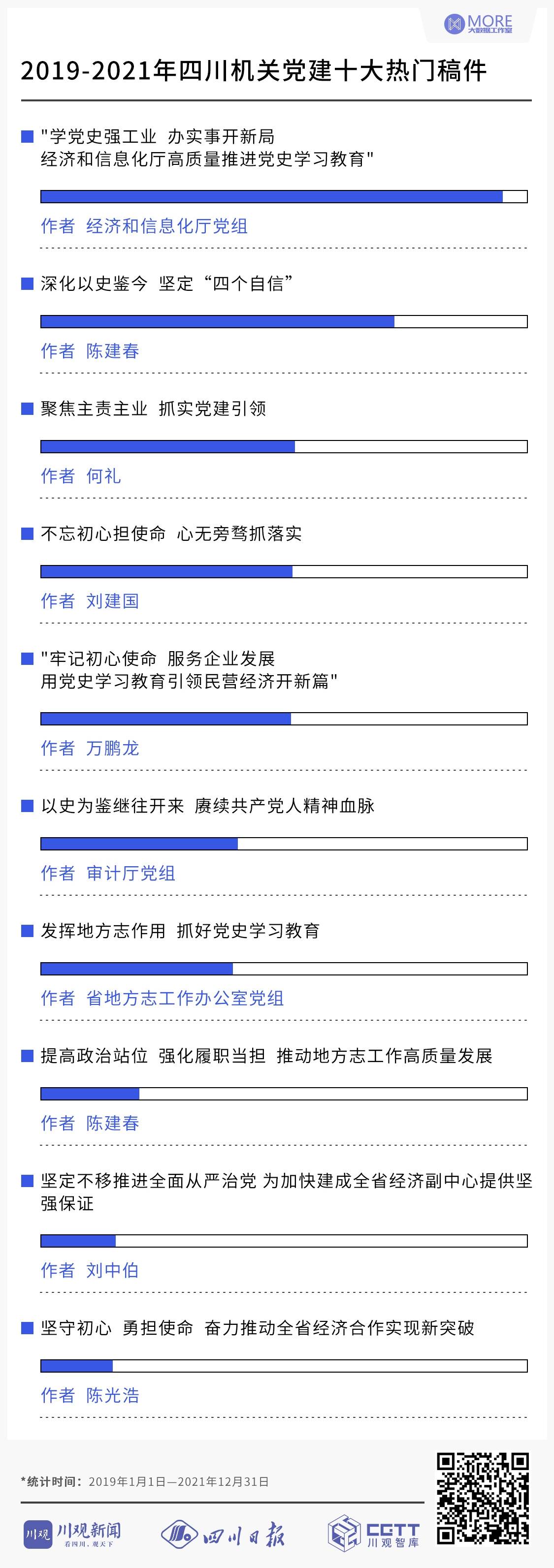 《四川机关党建》是中共四川省直属机关工作委员会主办的党建类杂志。近五年来,省直部门党组(党委)、市(州)党委理论学习中心主要负责同志在《四川机关党建》期刊上发表署名文章247篇,机关基层党支部和个人学习心得体会135篇。通过对这些文章的全网传播情况数据分析,2019-2021年间,四川机关党建相关稿件被转载、引用6万余次。其中,传播量最高的10篇稿件均被转载、引用2000次以上,经济和信息化厅党组发布的《学党史强工业 办实事开新局 经济和信息化厅高质量推进党史学习教育》一文热度最高,达到了13295次。