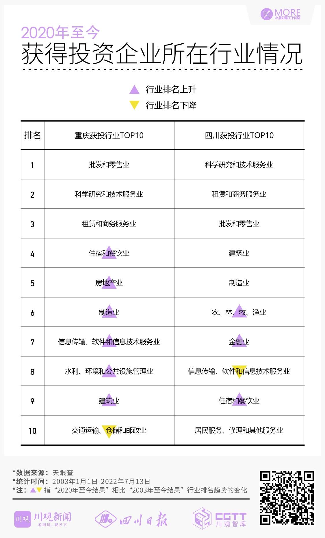 2020年1月至今,按重庆和四川获得投资的企业所在行业,科学研究和技术服务业、批发和零售业、租赁和商务服务业分列投资数排名前三,分别占总投资数的31.8%、23.7%和21.4%。对比2003年1月至今的数据结果,四川、重庆分别获得投资前三甲行业依然保持不变。
