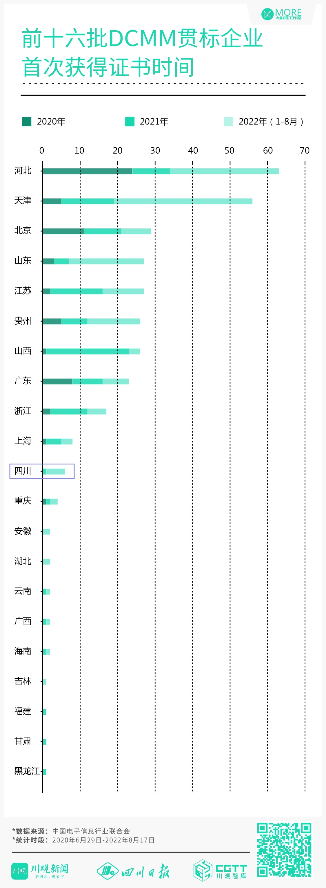 数据管理能力成熟度贯标评估工作推进三年来,DCMM贯标企业数量逐年递增。2022年提速明显,前8个月新增152家DCMM贯标企业,接近前两年贯标企业的总和。从最新增量来看,天津、河北、山东、贵州和江苏等地2022年新增DCMM贯标企业均超10家。从最新增速来看,山东和四川DCMM贯标企业数量2022年前8个月相较2021全年增长了4倍。
