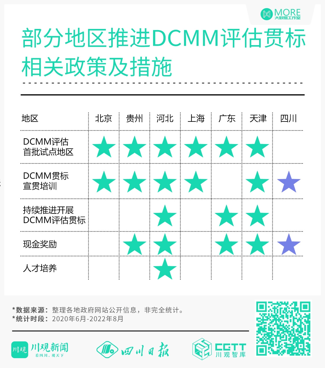 以DCMM贯标企业获评时间、数量和等级数据为基础,川观智库数据团队选定贯标数量多的河北、天津,获评等级较高的北京、上海和广东,以及西部DCMM贯标评估先行地区贵州作为先进对照组,梳理各地政府部门发布政策和措施,反映地区支持力度。