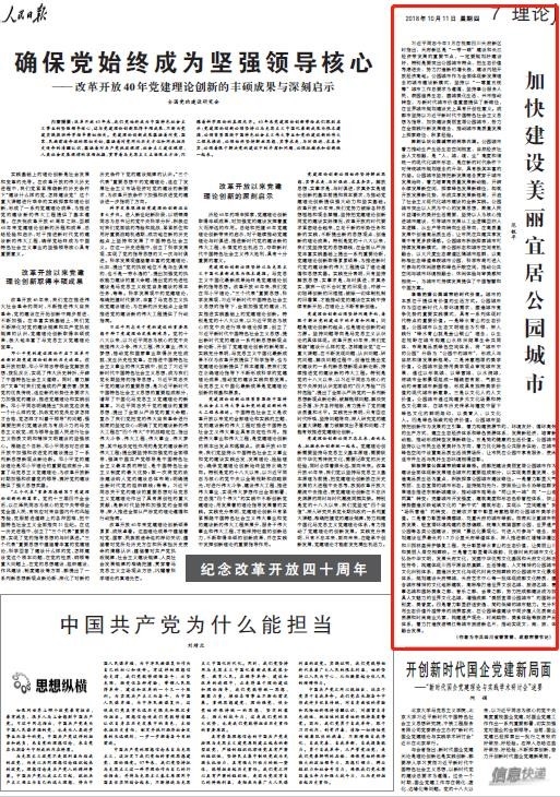 10月11日,中共四川省委常委、成都市委书记范锐平在《人民日报》发表署名文章《加快建设美丽宜居公园城市》。范锐平在文章中指出,加快建设美丽宜居公园城市需要深刻认识公园城市的科学内涵、准确把握公园城市的时代价值,同时要积极探索公园城市的建设路径。